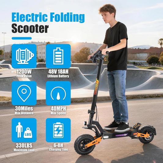1200W Peak Motor Fold Adult Electric Scooter 48V 18AH 40MPH 11-inch off-roadTires Front and Rear Disc Brakes and Shock Absorbers