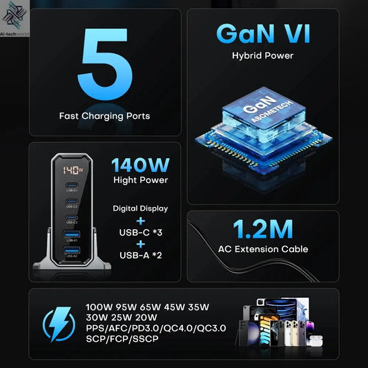 ASOMETECH 140W GaN USB Type C Fast Charger Multiple Ports QC4.0 PD Quick Charger For Macbook Laptop Tablet iPhone 14 Samsung S23
