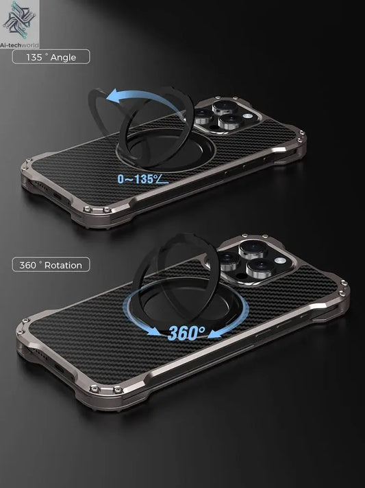 R-just Metal Carbon Fiber Case For iPhone 16 15 14 13 Pro Max Cover Lightweight Aluminum Alloy Funda Coque Built-in Holder Ring