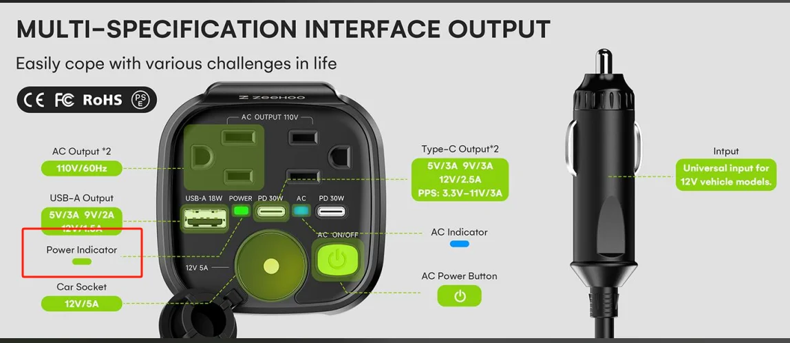 Efficient Power Conversion: Converts 12V D/C from your car into 110V AC, providing a reliable power source for small appliances, electronic gadgets, and other power-hungry devices.