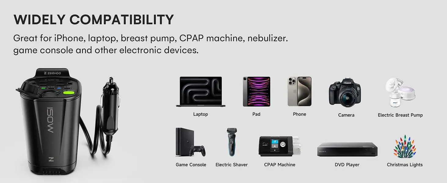 Whether you are camping, traveling, or just need power during a roadside stop, this 150W Car Power Inverter