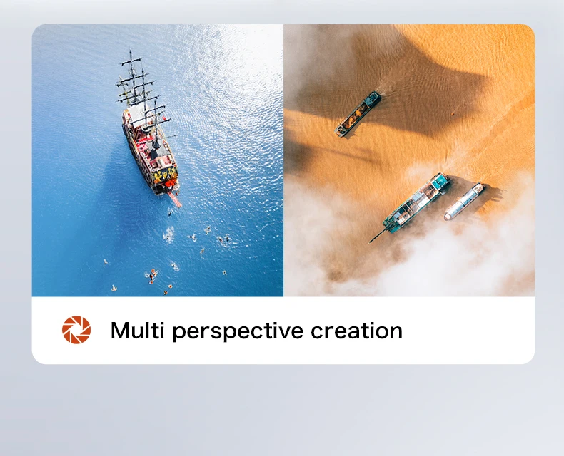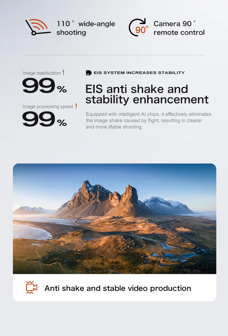 Place a wide-angle 8K high-definition WIFI lens in the front lens: A high-definition lens with optical flow positioning at the bottom, a pan tilt three-axis stabilization design, and an EIS electronic anti shake feature to make photos clearer in rows, with an image transmission distance of 5KM.