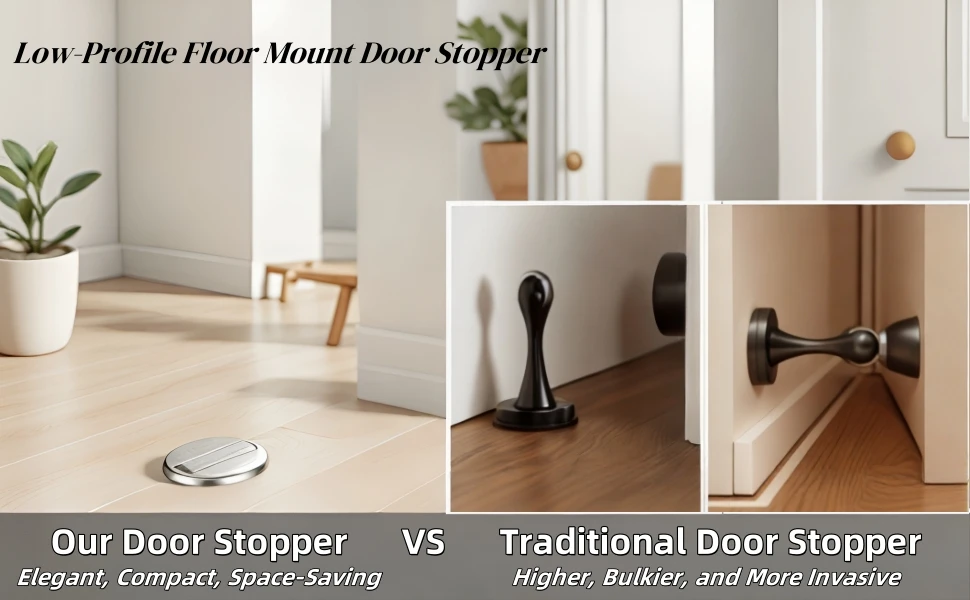 【High Quality & Long Term Life】Our magnetic door stopper is made of zinc alloy metal. he brushed stainless steel finish resists daily scuffing and corrosion for long term life and reliability. magnetic door stopper on the ground without bumps will not trip feet, door close to the blocking piece will only pop up,Does not take up space, It won't affect the daily cleaning and not easy to trip children.