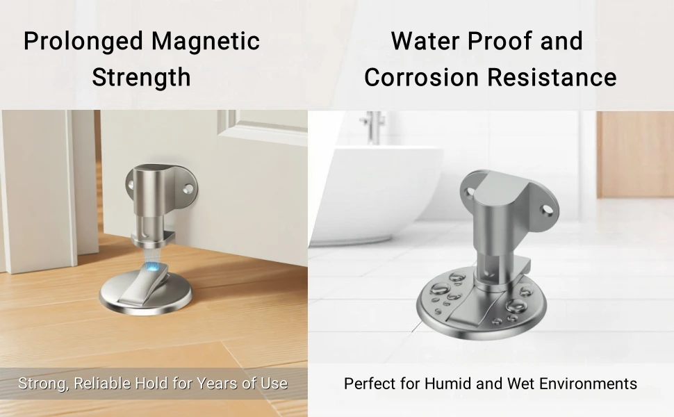 【Strong Magnetic】Magnetic door stopper is designed to hold the door securely in place. It prevents the door from closing suddenly on windy days.Make Your kids and pets enjoy themselves and keep away from injury by heavy slamming doors. Make your work more relax!The floor door stopper can effectively protect your walls from damage.