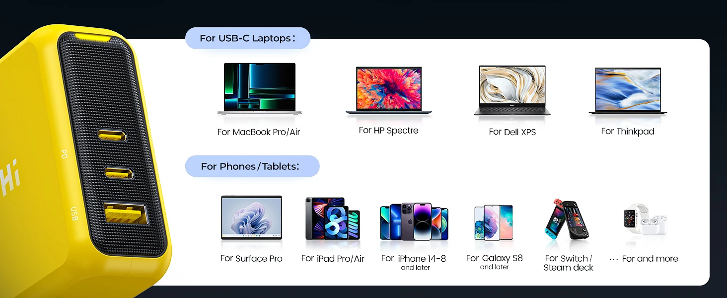 AOHI MagCube 140W Charger is compatible with MacBook Pro 16, 15, 14, 13", MacBook Air, Dell XPS 15/13, HP Spectre/HP Chromebook, iPad Pro, iPhone 15 Pro/14 Pro Max/13/12, Galaxy S23 Ultra/S22, Switch, Steam Deck, and More; Support Samsung 45W super fast charge 2,0 charging protocol; Dell laptop series cannot be charged at full speed due to charging protocol restrictions