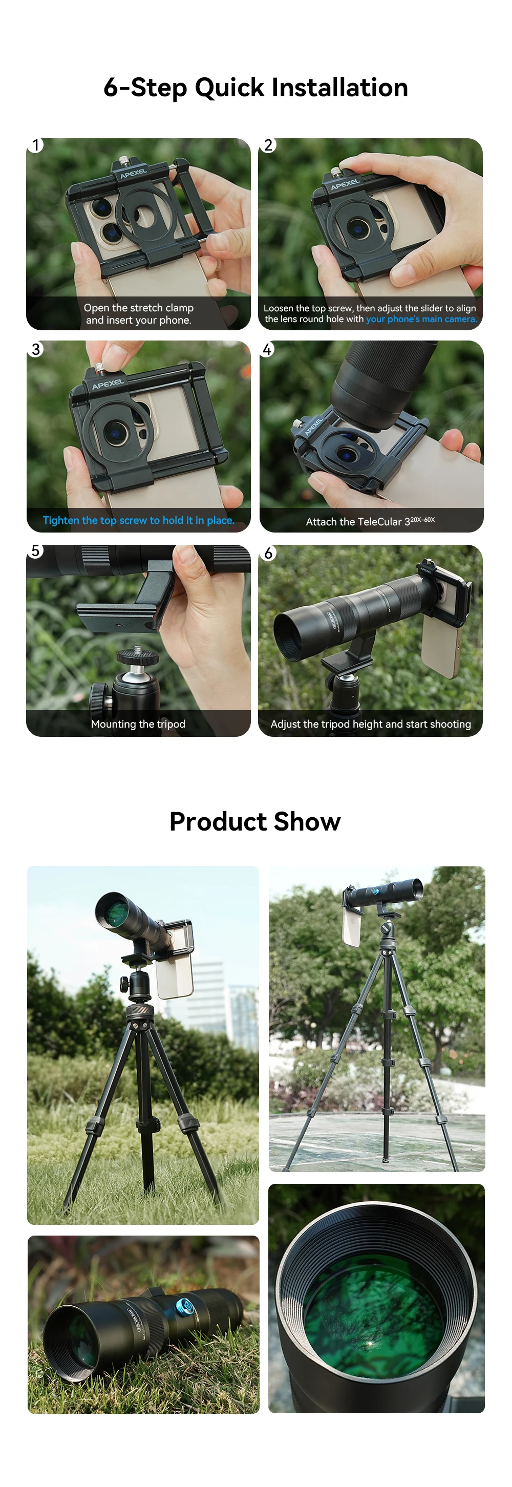 APEXEL Zoom Lens 20x-60x Telephoto Telescope Lenses Universal High Power Tele for Bird-watching Camping iPhone Android Phones