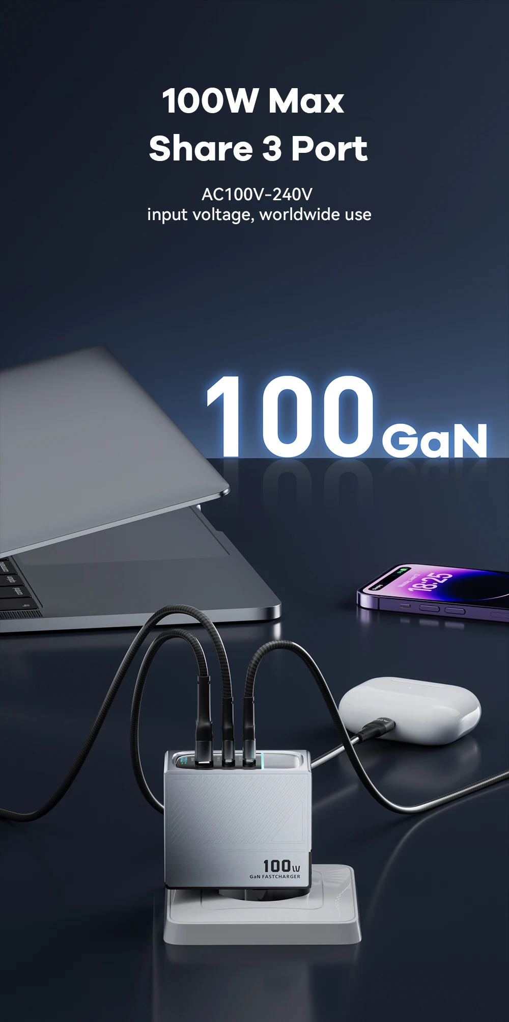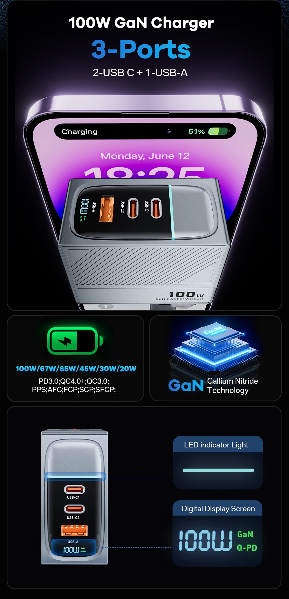 The ASOMETECH 100W GaN Charger features advanced GaN technology, offering a compact and highly efficient charging solution. Equipped with two USB-C ports and one USB-A port, it enables simultaneous charging of multiple devices. Supporting protocols like Huawei Quick Charge, Samsung Adaptive Fast Charge, USB PD, and Qualcomm Quick Charge, it delivers rapid power safely through intelligent charging management. With a maximum output of 100W, it’s ideal for laptops, tablets, and smartphones. The charger includes a display screen for real-time monitoring and holds multiple certifications including UL, RoHS, FCC, and CE, ensuring reliability and quality performance.