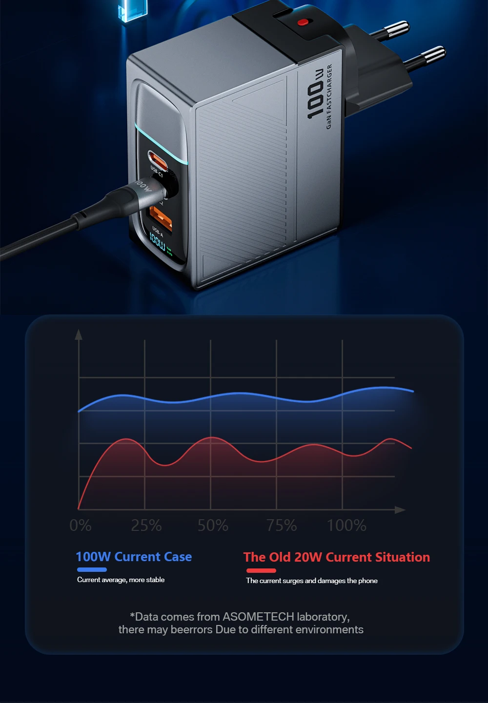 💪【LED Indicator + Digital Display】: ASOMTECH 100W charger with column LED indicator and LCD digital display, you can see the actual output power value when charging.