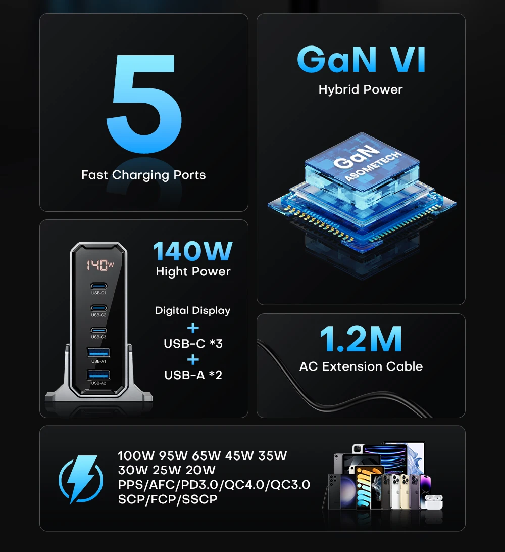 💪【5 in 1 USB C Charger】: This desktop USB C charger comes with 5 USB output ports and fast charging protocols such as PD3.0 QC4.0 QC3.0 PPS AFC FCP SCP SSCP for simultaneous fast charging of multiple devices. 3 USB-C ports and 2 USB-A ports share a total output of up to 140W. The cool thing is that you can fast charging 2 laptops at the same time, which could be the equivalent of having 2 pieces of 65W USB c charger.💪【Faster Power, Super Charging】: USB-C1/C2/C3 all support up to 100W PD PPS fast charging, via 100W USB-C to USB-C cable, MacBook Pro 15.4" charges from 0% to 100% in less than 2 hours, for iPhone 14 / Samsung S23 charges to 60% in 30 minutes. USB-A1/A2 supports up to 60W power output , supports QC3.0 FCP SCP SSCP and other fast charging protocols;💪【Multi-port GaN technology】: desktop charger using new GaN technology support, we achieve multiple ports to support high power fast charging output and smaller size with safety in mind;Note: