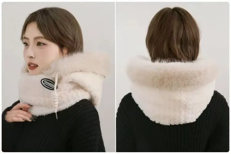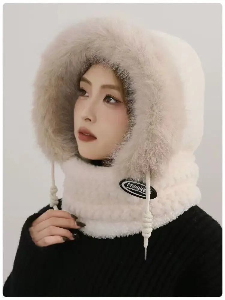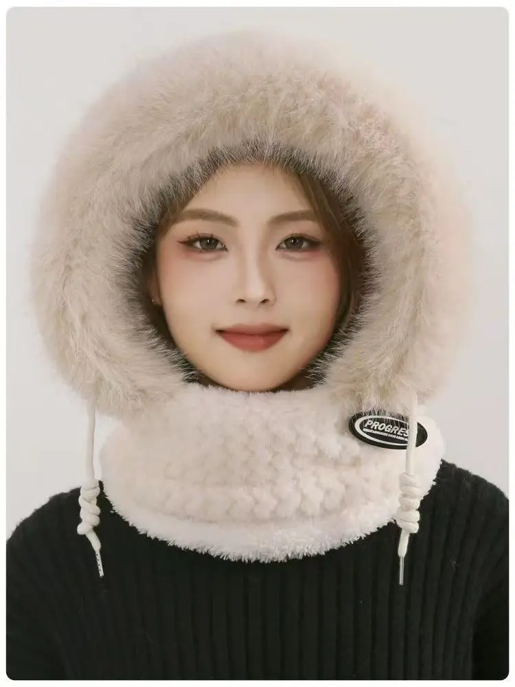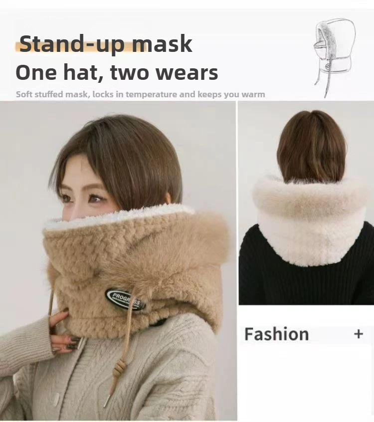 Autumn and Winter Women Thermal Plush Hat Hood Scarf and Mask Ear Protection Windproof Thick Design for Riding Outdoor