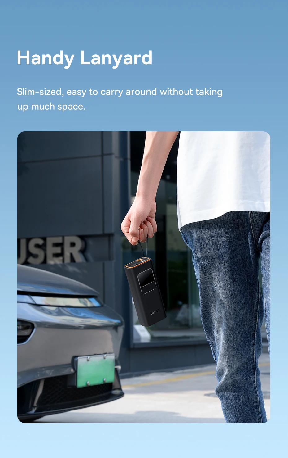 Portability is a key advantage of the Baseus Wireless Air Pump. Weighing less than your typical pump, it's easy to carry wherever you go, making it an essential tool for travelers and outdoor enthusiasts. The rechargeable battery ensures that you can use it without being tethered to a power outlet. Plus, its wireless operation means you can inflate tires in any location, whether at home, on the road, or in a remote area. With Baseus, convenience and reliability are always at your fingertips.