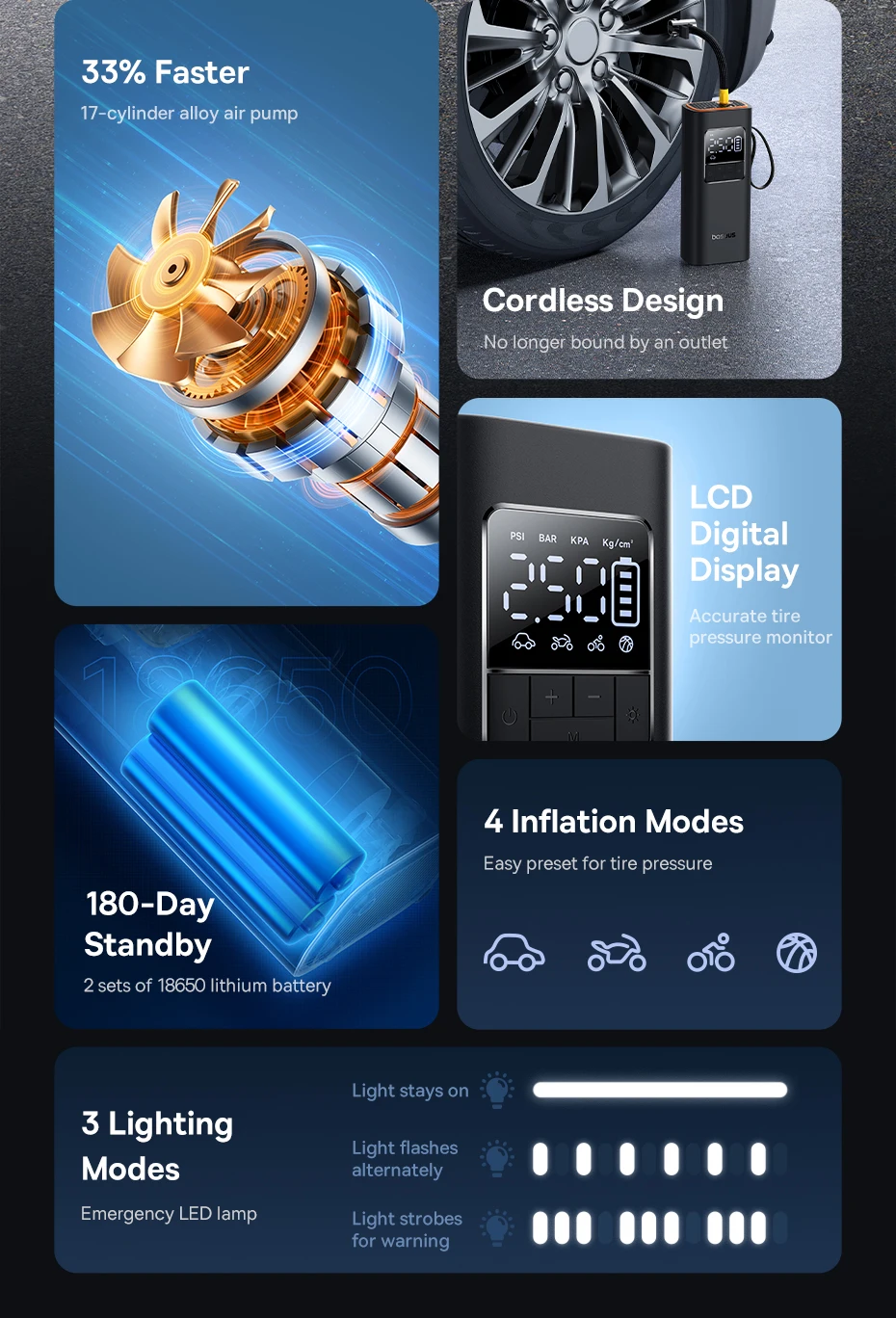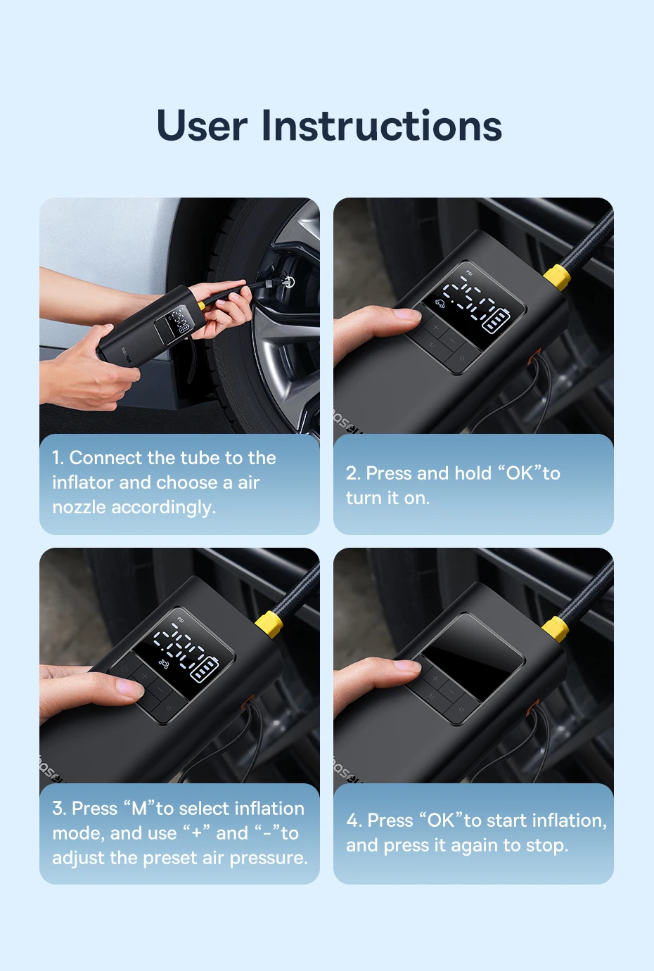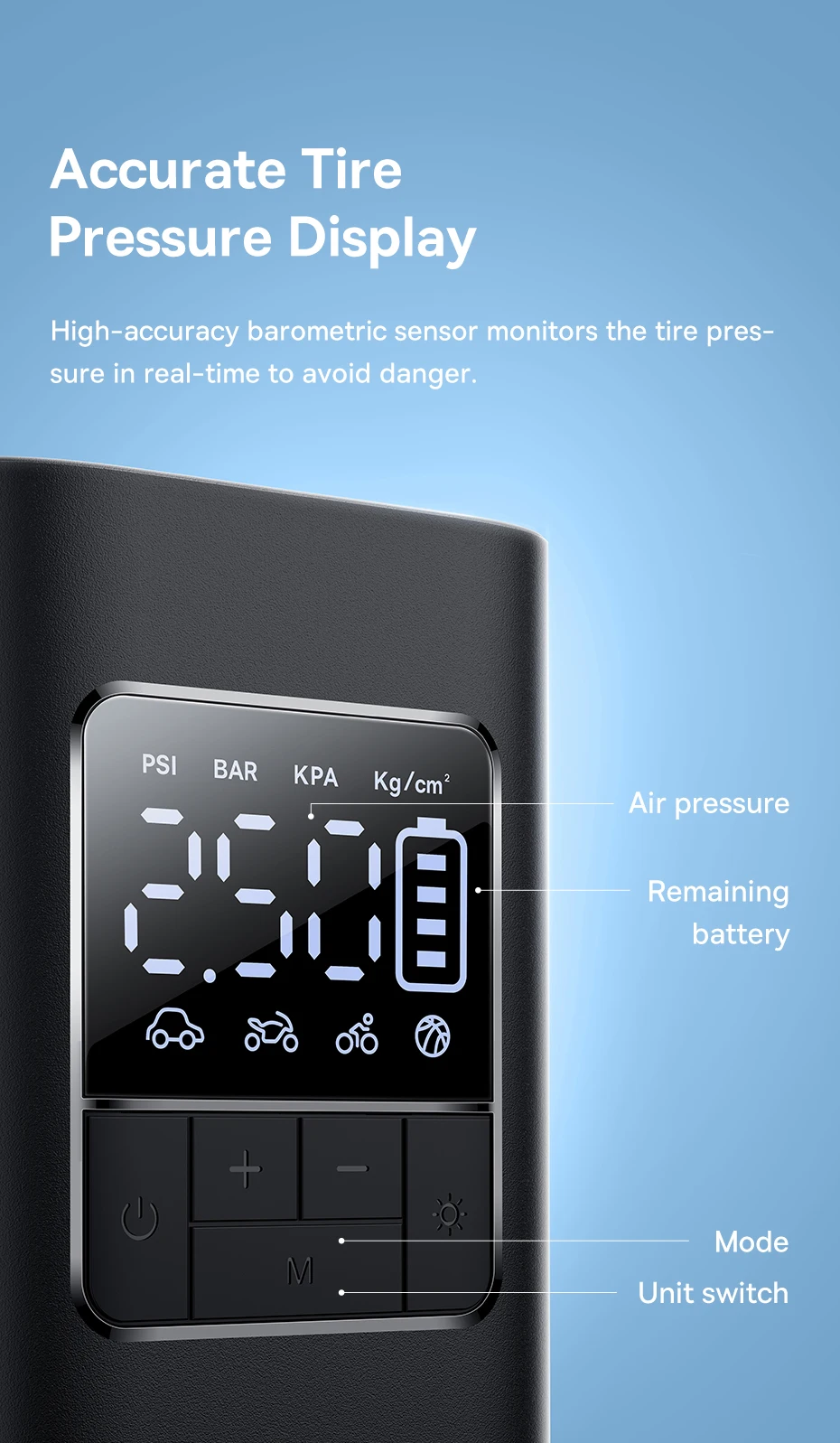 One of the standout features of the Baseus Wireless Air Pump is its digital display, which makes it incredibly user-friendly. The display shows real-time pressure readings so you can monitor inflation. You can select from multiple preset modes for inflating different types of tires and objects, such as cars, motorcycles, and bicycles. This intuitive interface allows you to operate the pump with ease, even if you're not technically savvy. Additionally, the automatic shut-off function prevents over-inflation by stopping the pump once the desired pressure is reached.