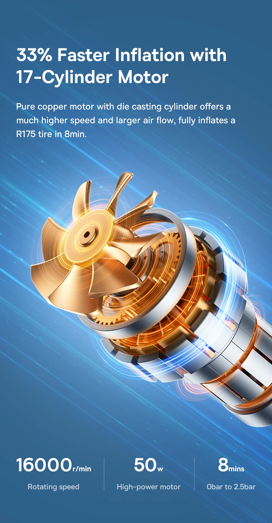 Pure copper motor with die casting cylinder offers a much higher speed and larger air flow, fully inflates a R175 tire in 8min.