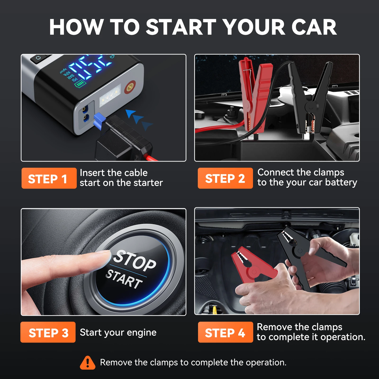 【Compact but Powerful】With Hihg Capacity to jump start a dead battery in seconds---up to 50 jump starts on a single charge and rated for gasoline engines up to All liters and diesel engines up to 10 liters. Even in extreme temperature, the powerful lithium battery booster will jump quickly. Suitable for car, truck, motorcycle, boat, RV or tractor and so on.