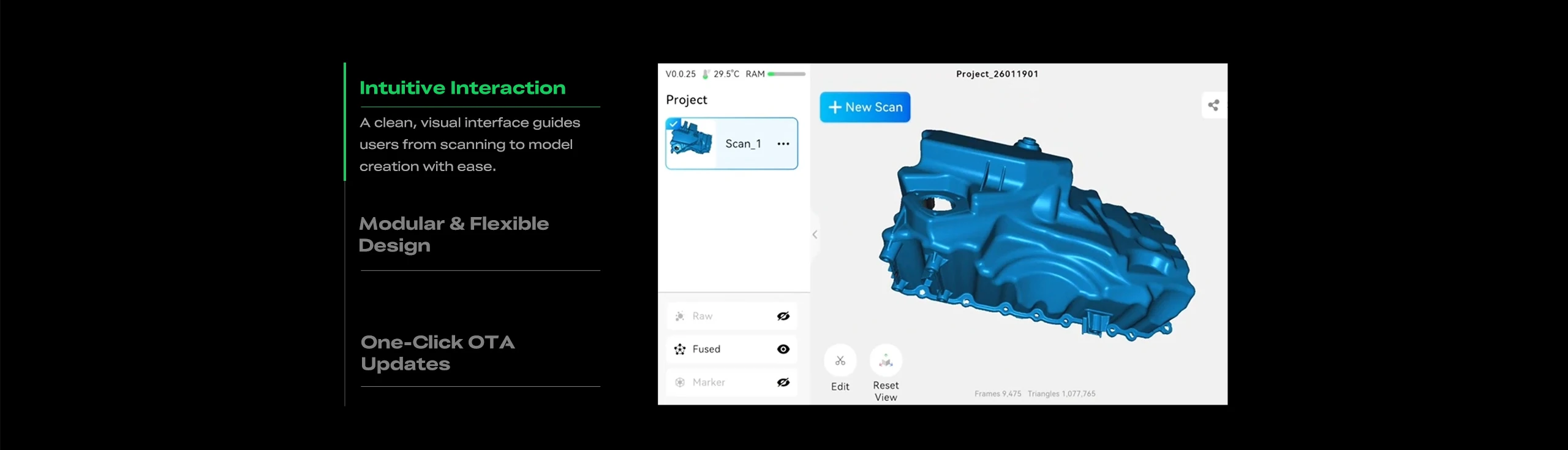 Diverse Tracking Modes: Supports Marker Tracking, Texture Tracking, and Geometry Tracking, suitable for scanning various types of objects (with or without markers, textured surfaces).