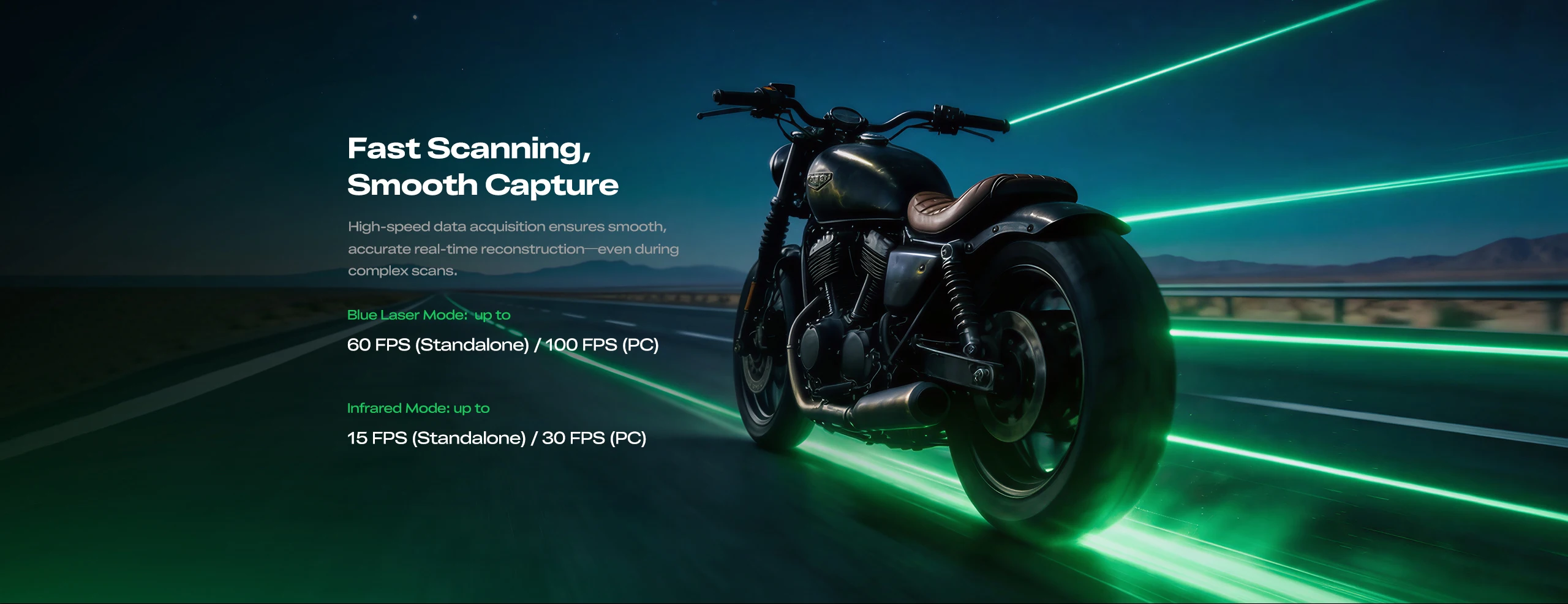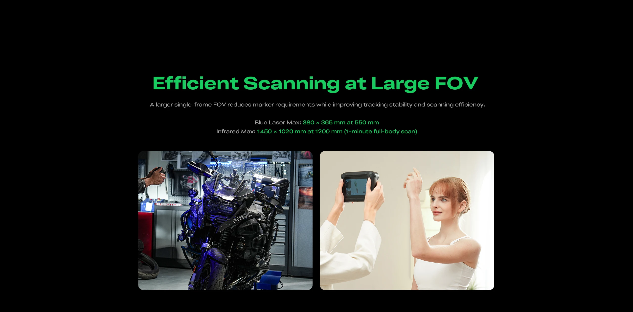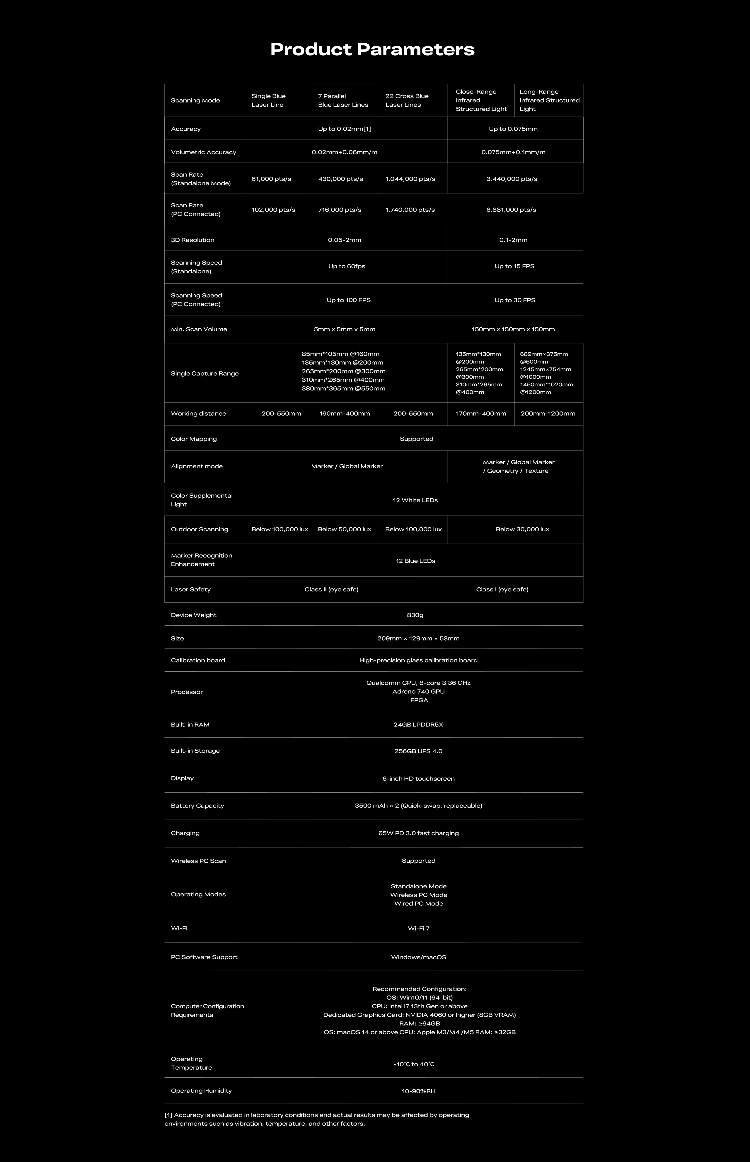 High-Speed Scanning: Up to 100fps scanning speed in PC connection mode. Scan rates up to 1,740,000 points/sec in Blue Laser mode and 6,881,000 points/sec in Infrared mode, significantly improving work efficiency.