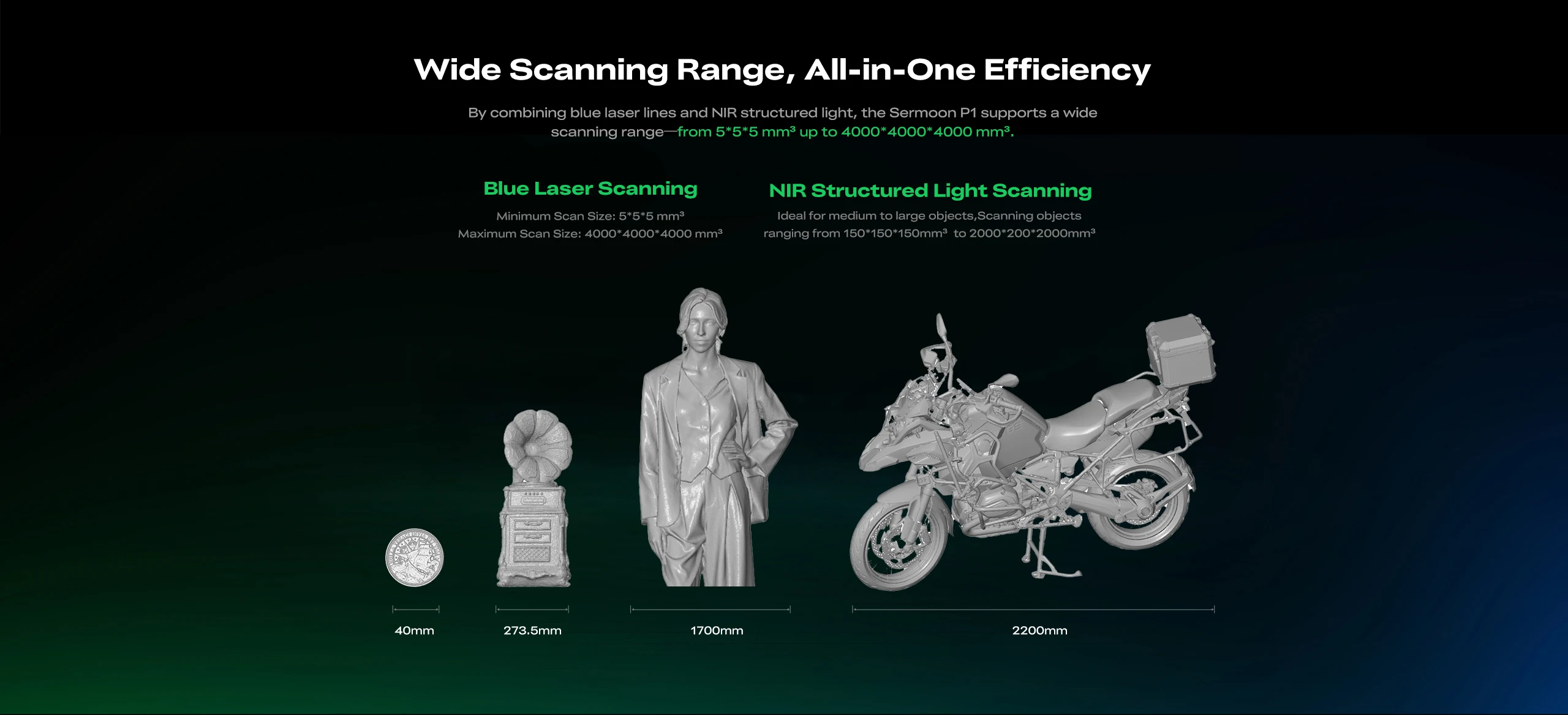 Wide Applicability: Supports scanning objects from as small as 5x5x5mm to large-scale scenes, featuring an extensive working distance (200-1200mm) and capture range.