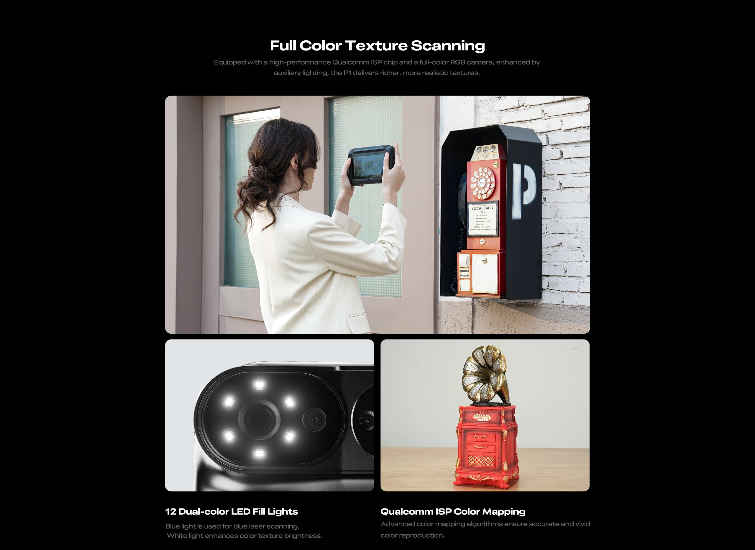 Color Mapping Function: Integrated 12 white LED fill lights capture object color information, enabling the generation of realistic color 3D models.