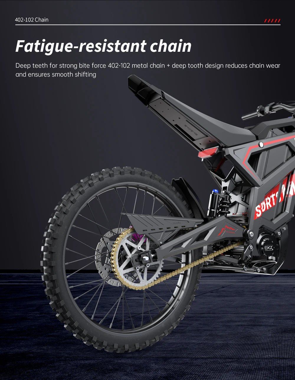 Rear Tire: 80/ 100-19 Front Brake: Single disc/φ220mm/Four-piston caliper