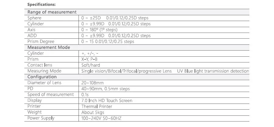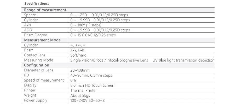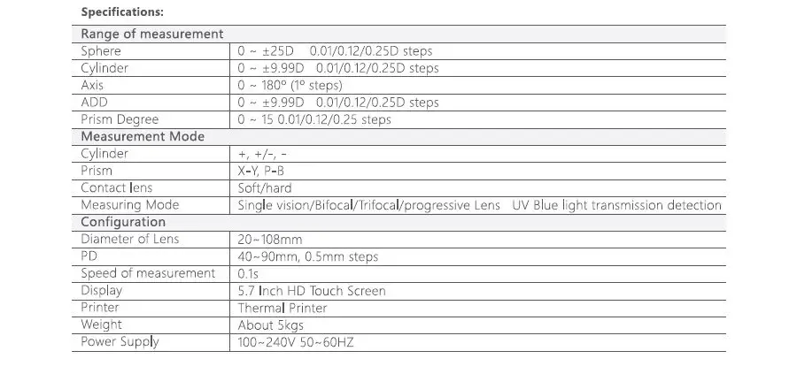 0 ~ ±9.99D 0.01/0.12/0.25D steps |