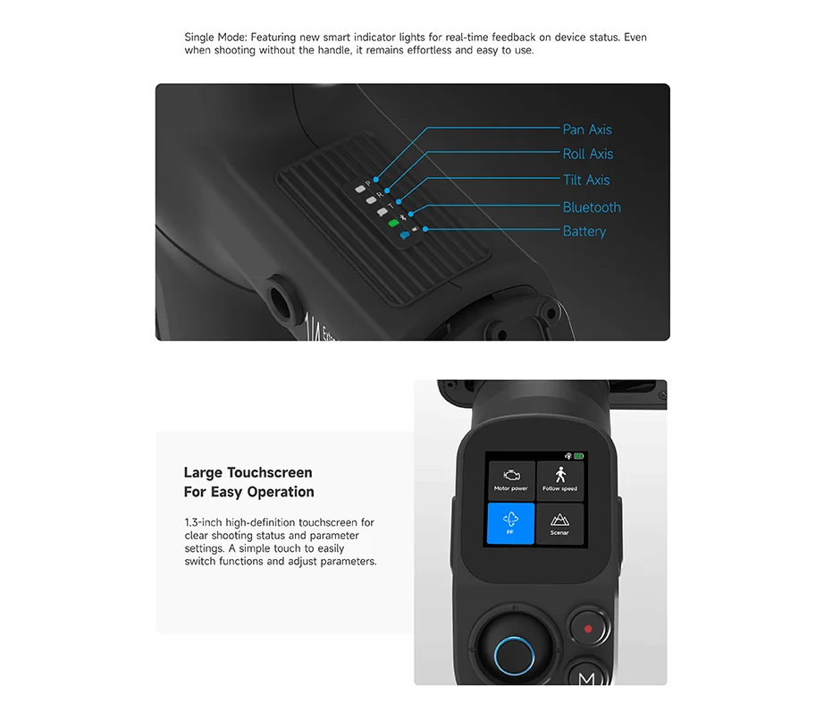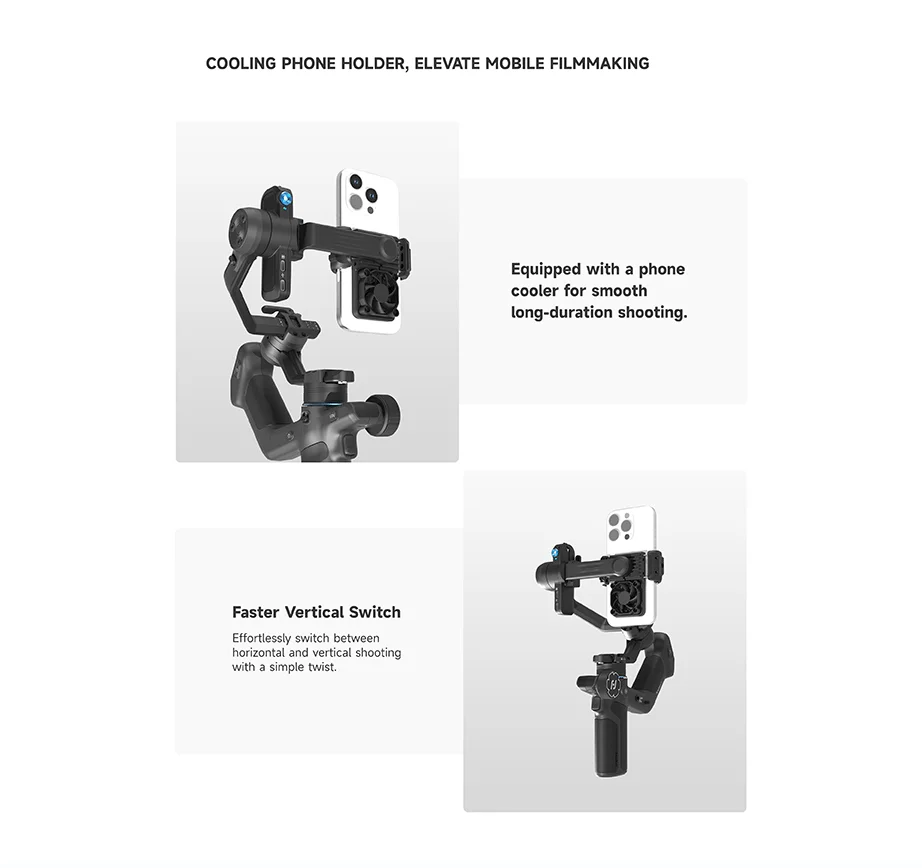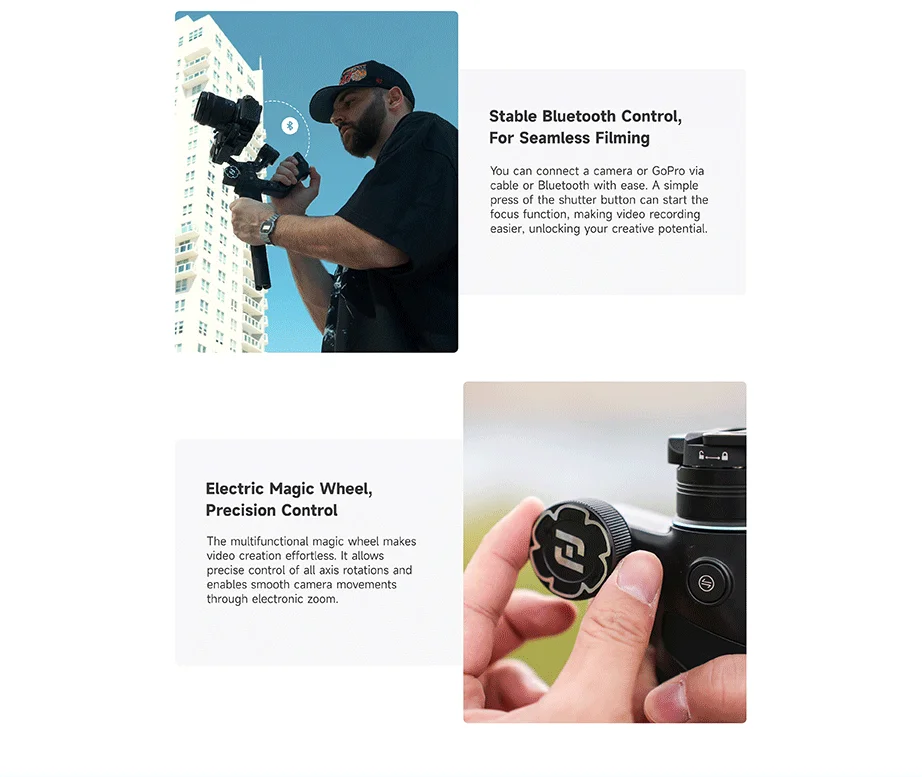 Compatible Devices: Compatible with select Sony, Canon, Nikon, Panasonic mirrorless and compact cameras; GoPro and similar action cameras; supports smartphones 52 to 88mm wide, under 9.5mm thick. For detailed compatibility, refer to FeiyuTech's official compatibility list.