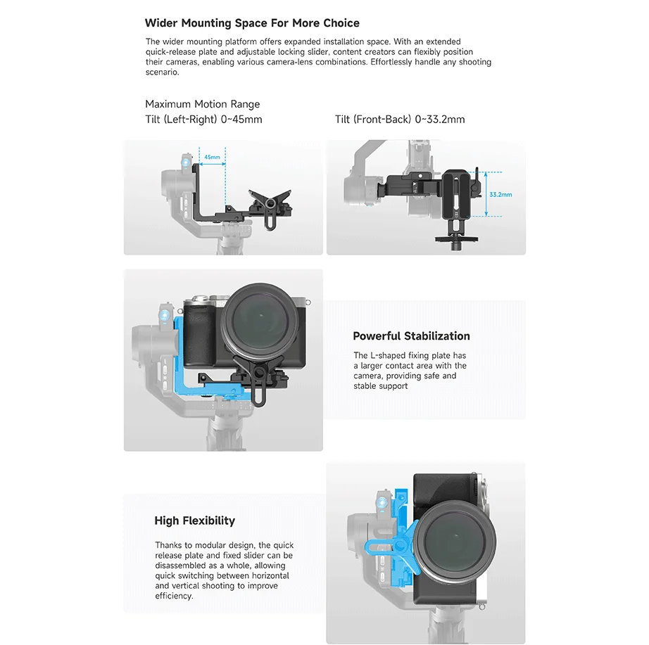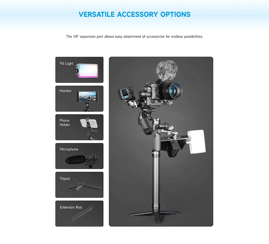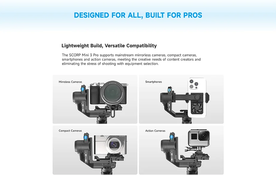 The SCORP Mini 3 Pro is designed to work with mirrorless cameras, action cams, and smartphones, catering to various photography needs. Its versatility is evident as it transforms easily between different devices, making it an ideal tool for content creators. Whether you're shooting a vlog or a high-action scene, this gimbal adapts to your style.