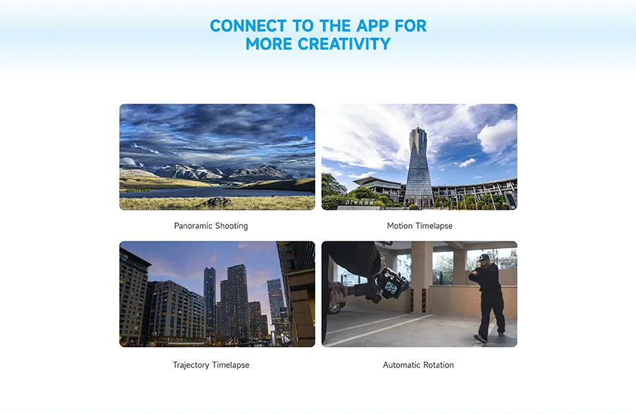 Special Modes: Time-Lapse / Long Exposure / Slow Motion / Panorama / Delayed Photo / Rotation / Orbit Mode / Follow Mode / Lock Mode
