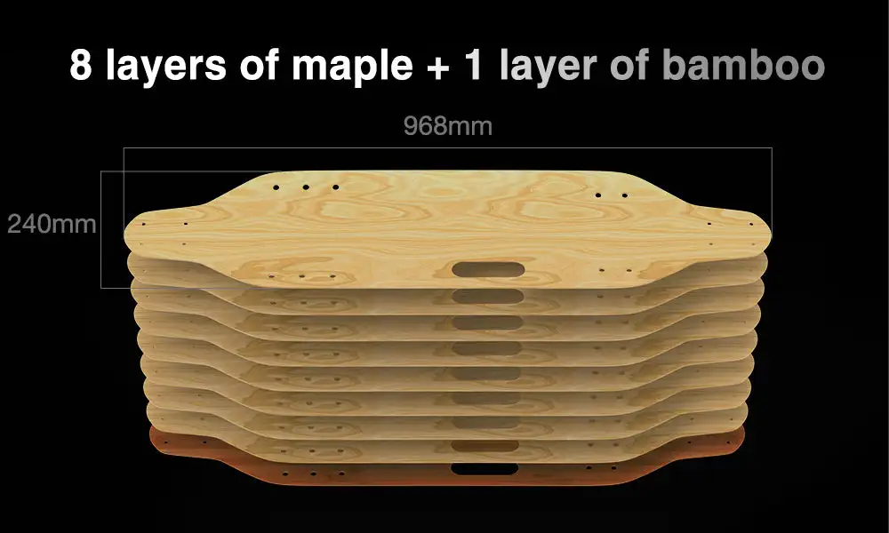 Made from 8 layers of Canadian maple, with a bamboo-style veneer, the deck offers a perfect balance of rigidity and flex. Its modest concave profile provides subtle grip without locking your stance โ ideal for long rides and smooth carving.