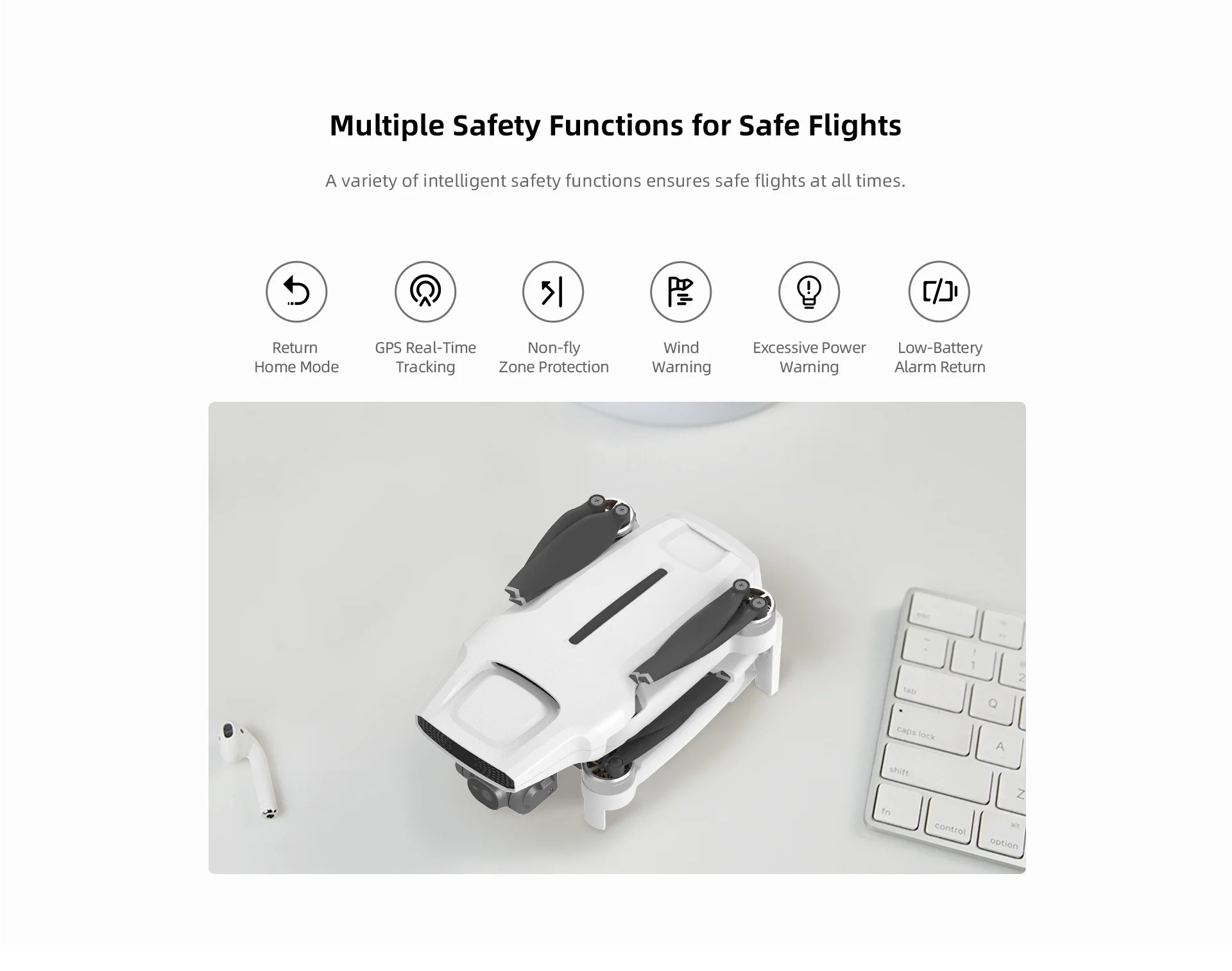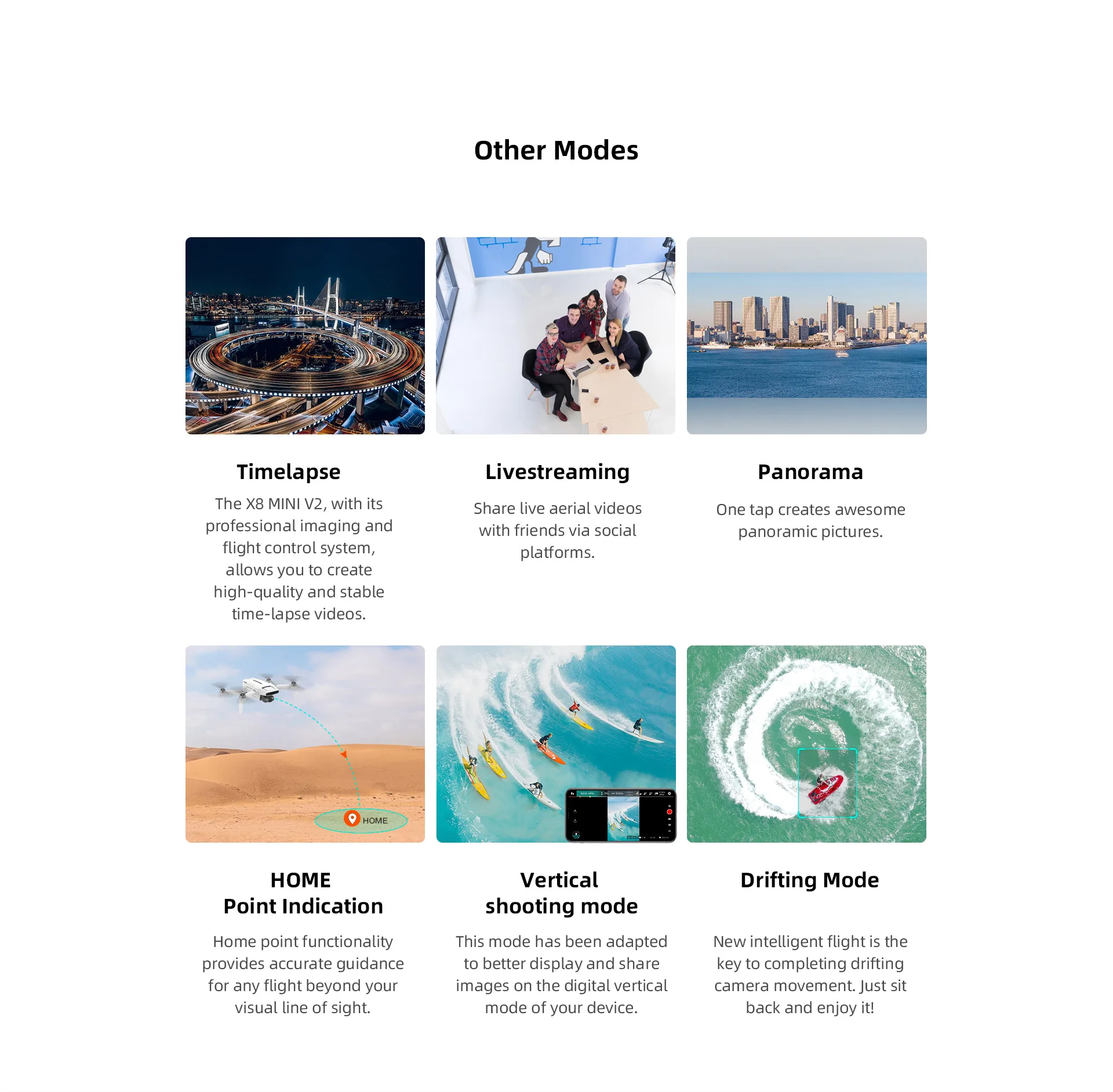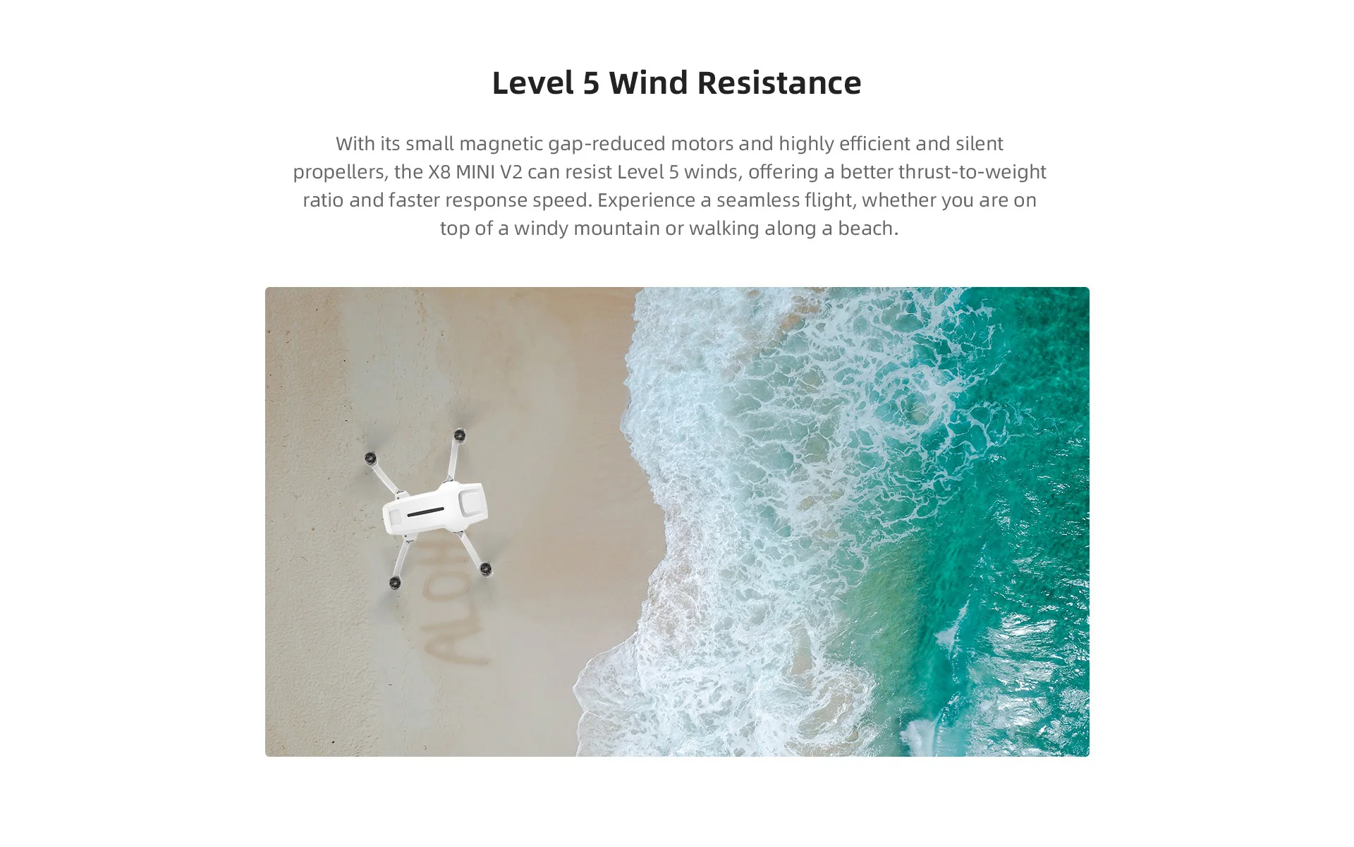 The FIMI X8 Mini V2 combines a micro-three-axis mechanical gimbal weighing only 28g and the latest professional control algorithm for a much improved accuracy of 0.005°,providing smooth and stable aerial images even at high speeds and in strong winds.
