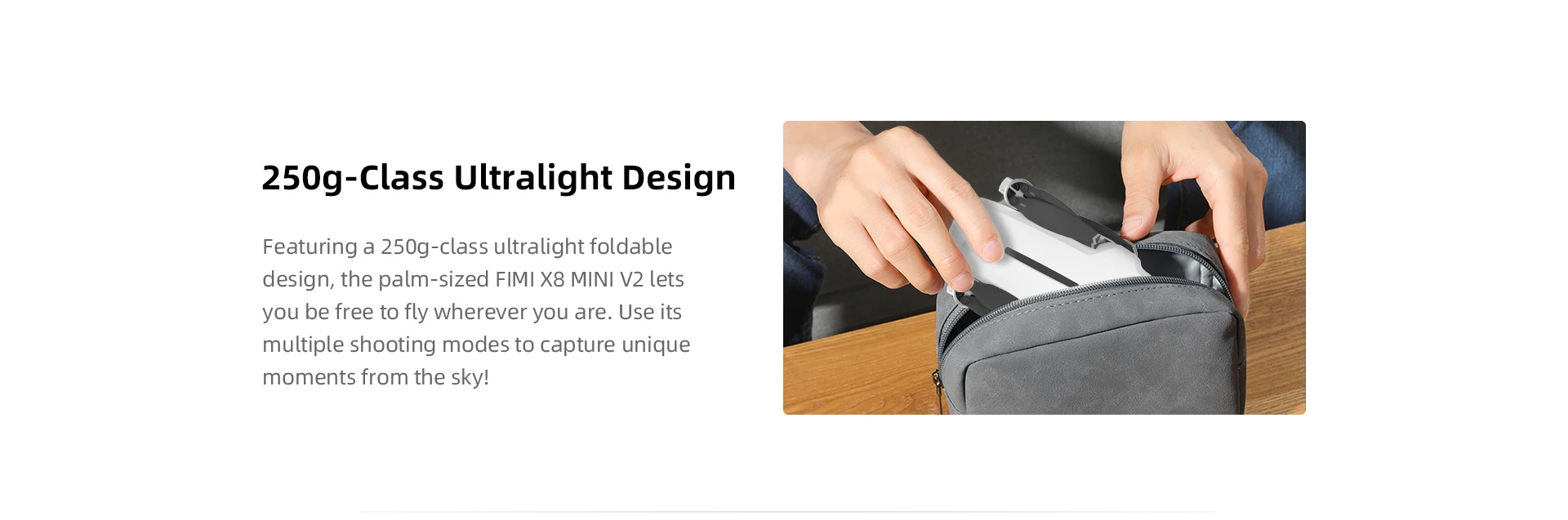 Featuring a 250g-class ultralight foldable design,the palm-sized FIMI X8 Mini V2 lets you be free to fly wherever you are.