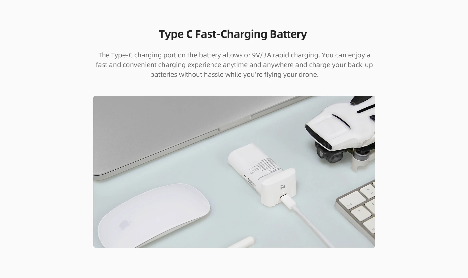 The Type C charging port on the battery allows or 9V/3A rapid charging.