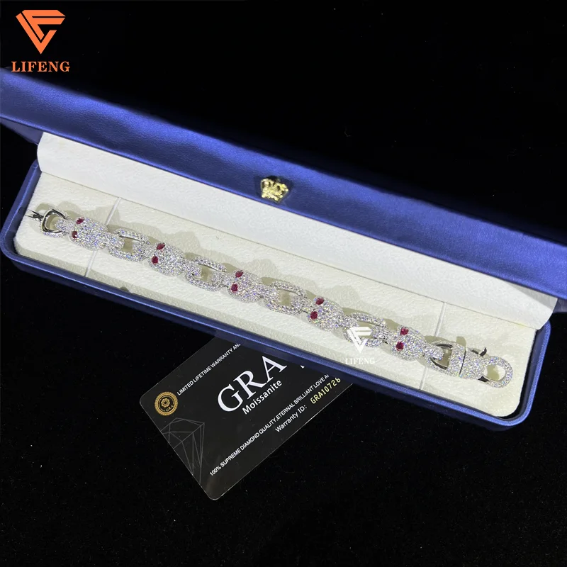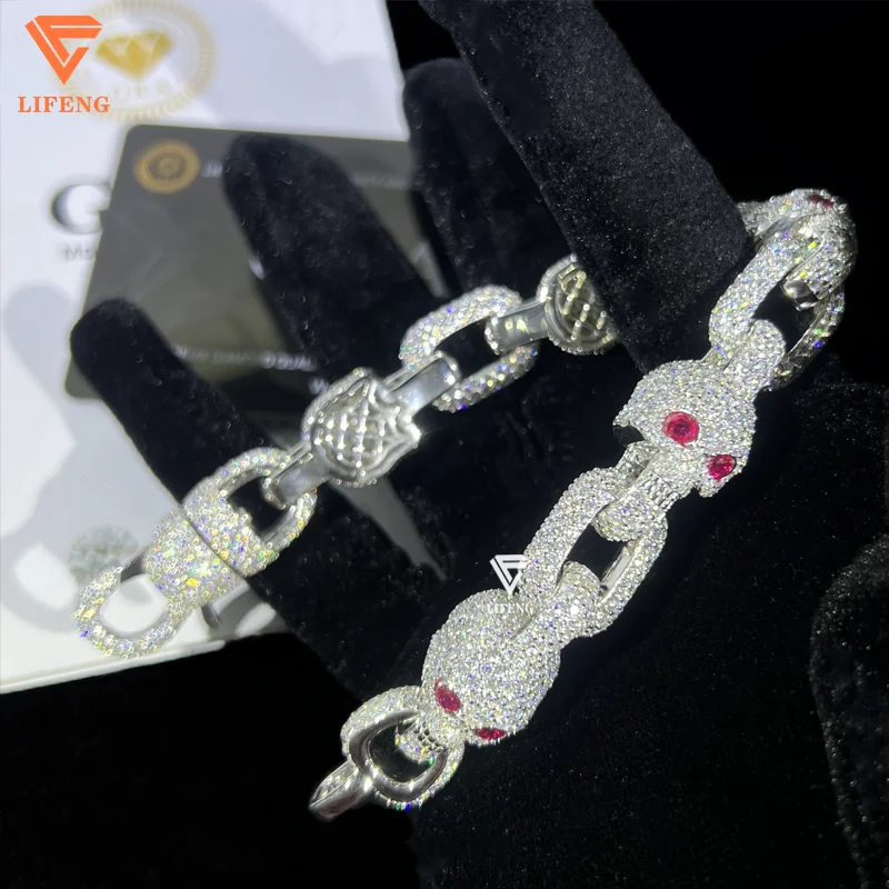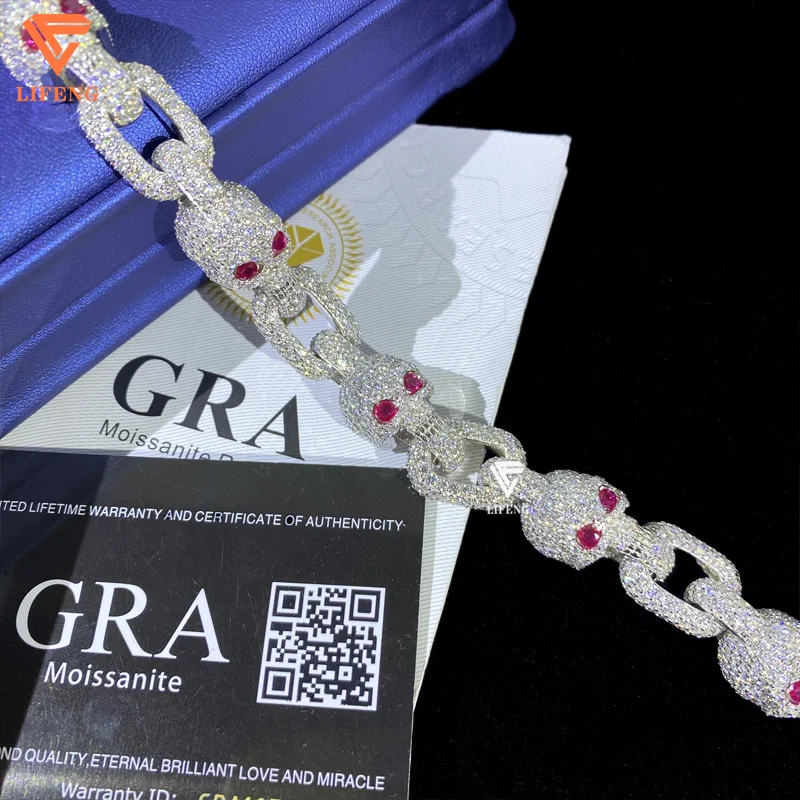 Lifeng presents this expertly crafted bracelet featuring a 13mm round brilliant cut moissanite skull with striking red eyes, set in 925 sterling silver. Designed with precision claw setting and plated options including silver, gold, and rose gold, this unisex piece blends hip-hop style with fine craftsmanship. Ideal for gifting or special occasions such as weddings, anniversaries, and engagements. Originating from Guangxi, China, the bracelet combines durable sterling silver with the captivating sparkle of moissanite, making it a versatile and distinguished accessory.