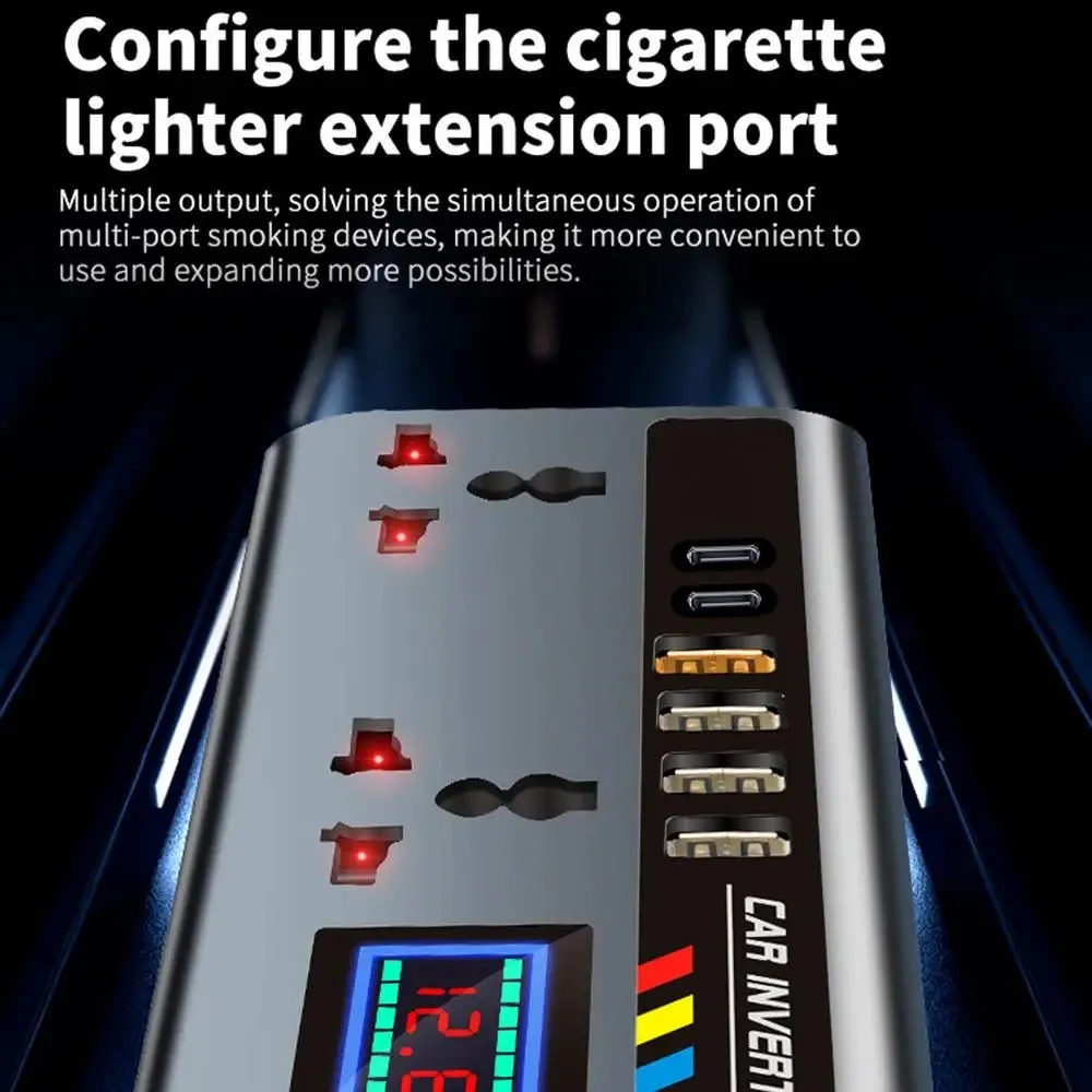 1.Nine Functional Outputs: Boasting double AC connections, 2 TYPE-C outputs, and 4 USB ports featuring PD and OC3.0 outputs, this car inverter provides unmatched versatility for all your charging needs with nine functional outputs.