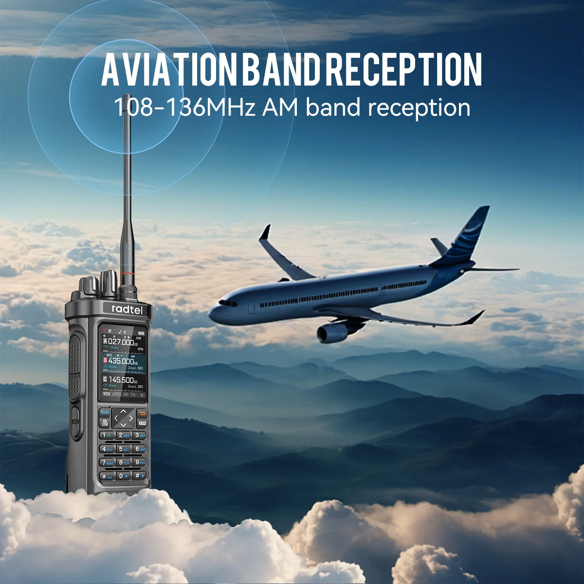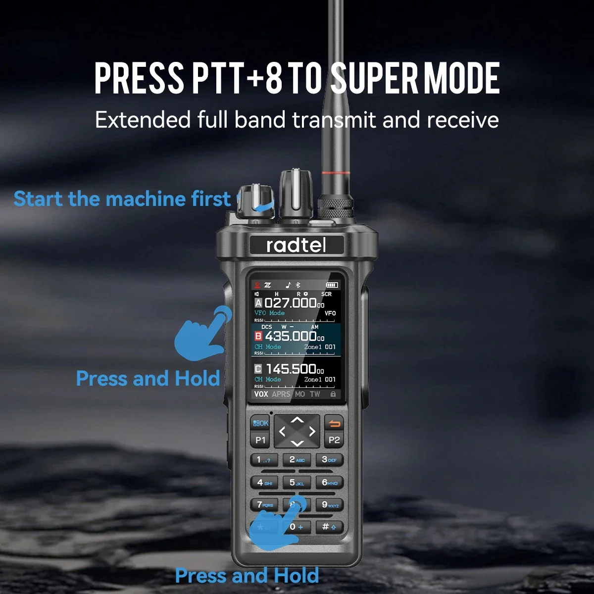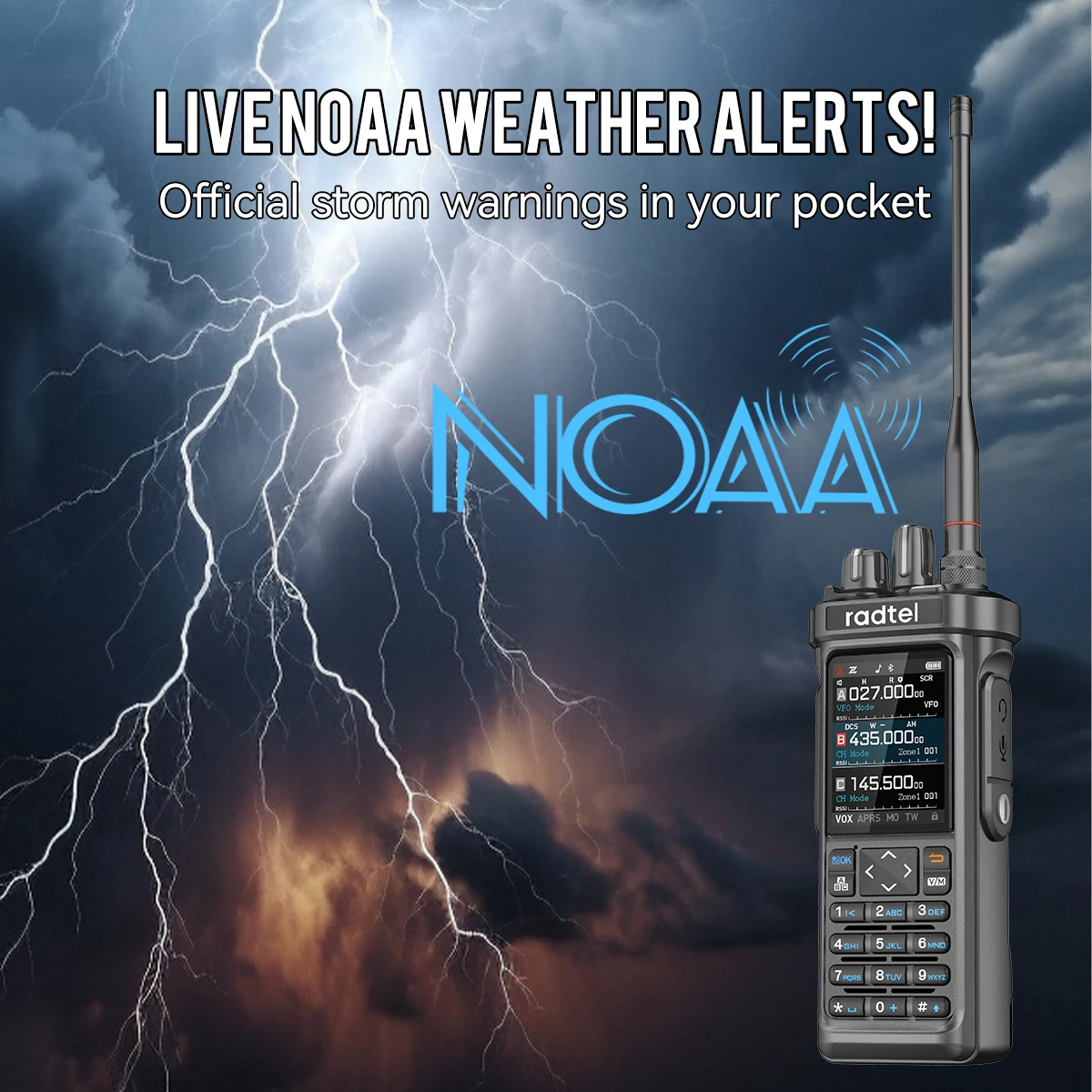 The Radtel RT-950 PRO is a versatile dual-band ham radio featuring Bluetooth app programming for seamless control on iOS and Android devices. It delivers up to 10W transmission power across multiple frequency ranges, including 27MHz, 400-520MHz, and 136-174MHz, ensuring reliable long-distance communication. Equipped with GPS/APRS functionality and a built-in spectrum analyzer, it enables precise position tracking and frequency monitoring. Additional features include Type-C fast charging with a desktop dock, wireless frequency copying, NOAA weather channel access, and shortwave reception. Note: use only Radtel-compatible accessories to avoid damaging the audio amplifier.