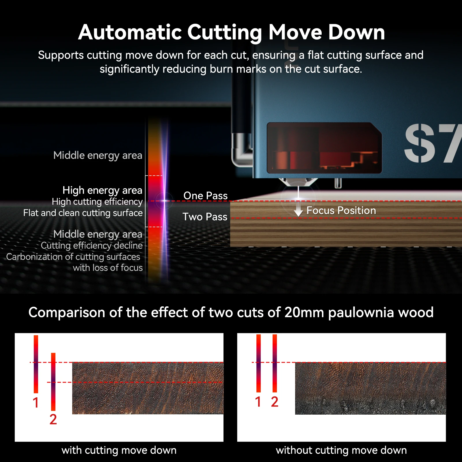 Sculpfun S70 Max adopts the latest fiber optic spot compression technology, with an ultra-fine spot size of 0.15*0.12mm. It supports Z-axis offset in LightBurn software and supports cutting move down for each cut, ensuring a flat cutting surface and significantly reducing burn marks on the cut surface.