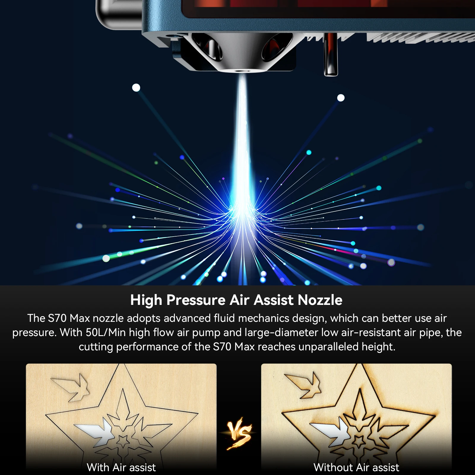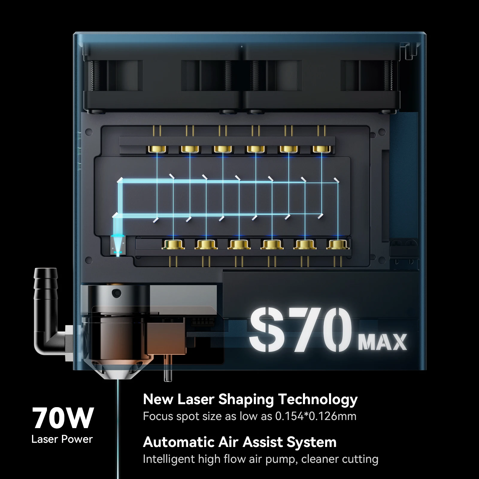 The S70 Max is a professional laser engraving machine which utilizes twelve 6W semiconductor laser chips with a maximum chip laser power of up to 72W, empowering the machine with higher performance and delivering the exceptional efficiency. Full 100% power with the standard 50L high flow air pump, it can cut up to 20mm plywood, 30mm paulownia wood, 10mm black acrylic.