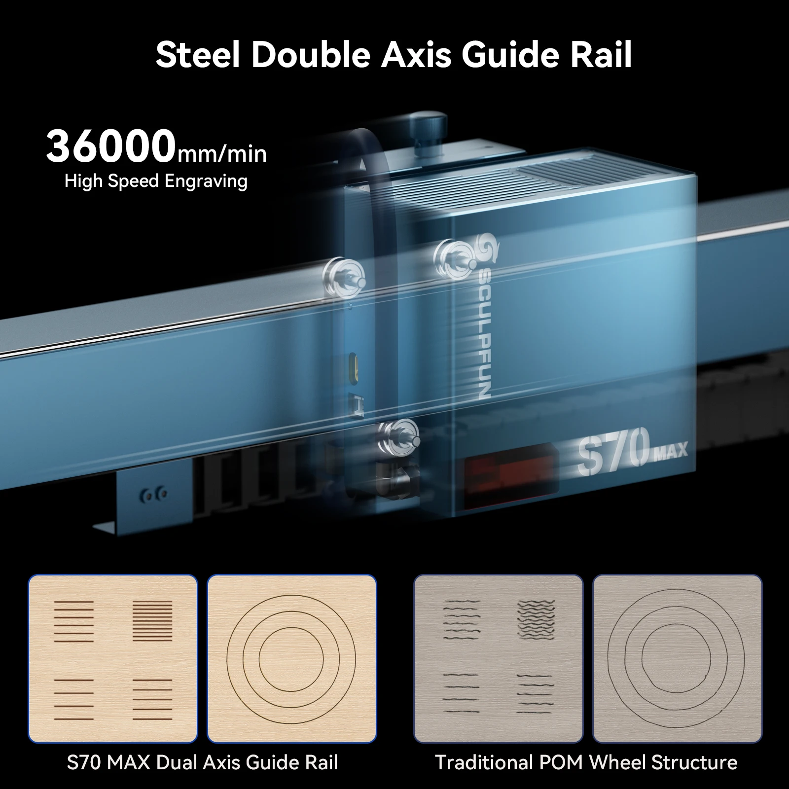 Featuring a frame placement area size measuring 980mm×1000mm, the Sculpfun S70 Max is perfect for accommodating super large materials. Its extra large working area of 830*800mm enables the processing of larger objects, catering to diverse needs. In addition, the maximum marking speed can reach up to 36000mm/min, which makes it easy to process large area cutting and batch engraving, ideal for studios, enthusiasts as well as professionals.