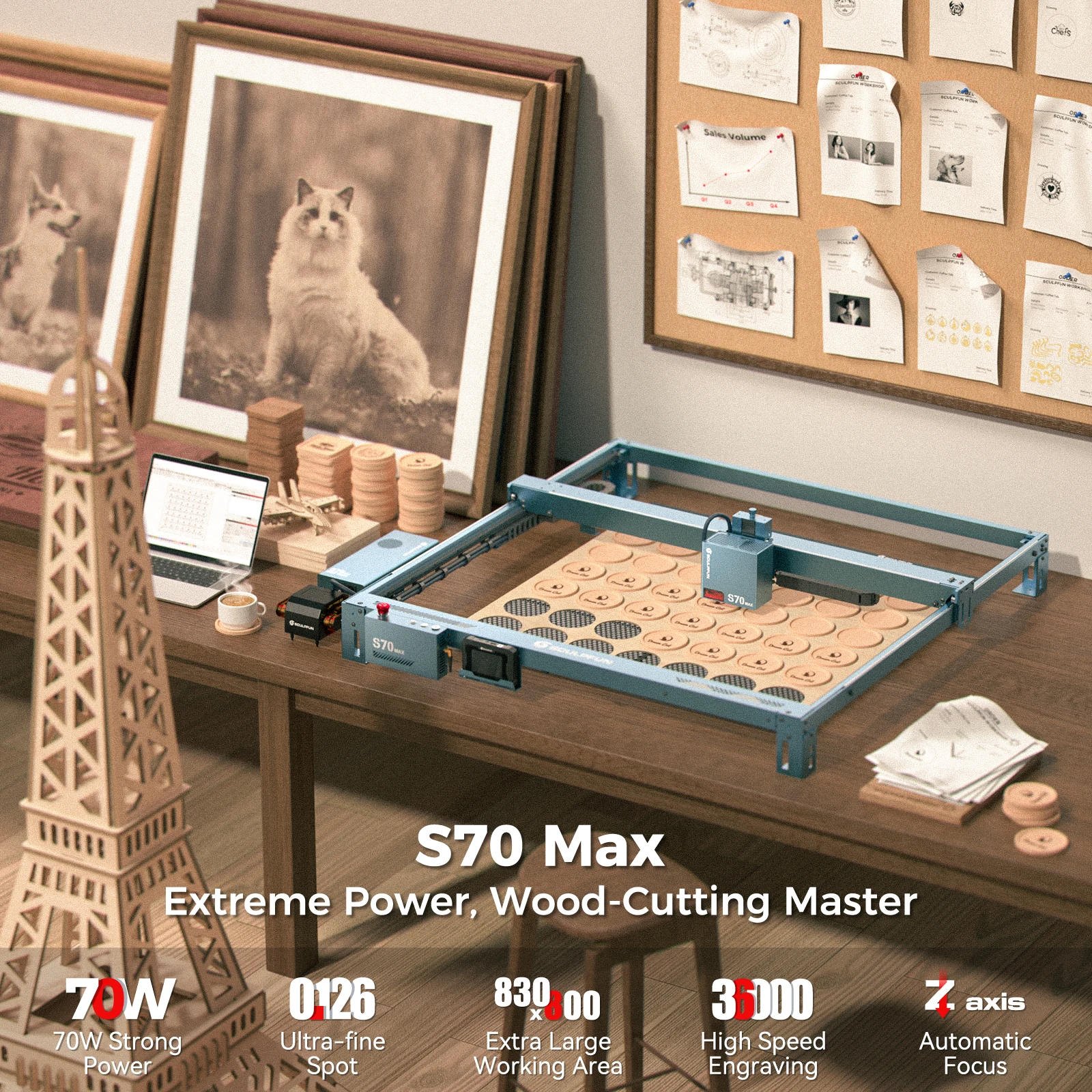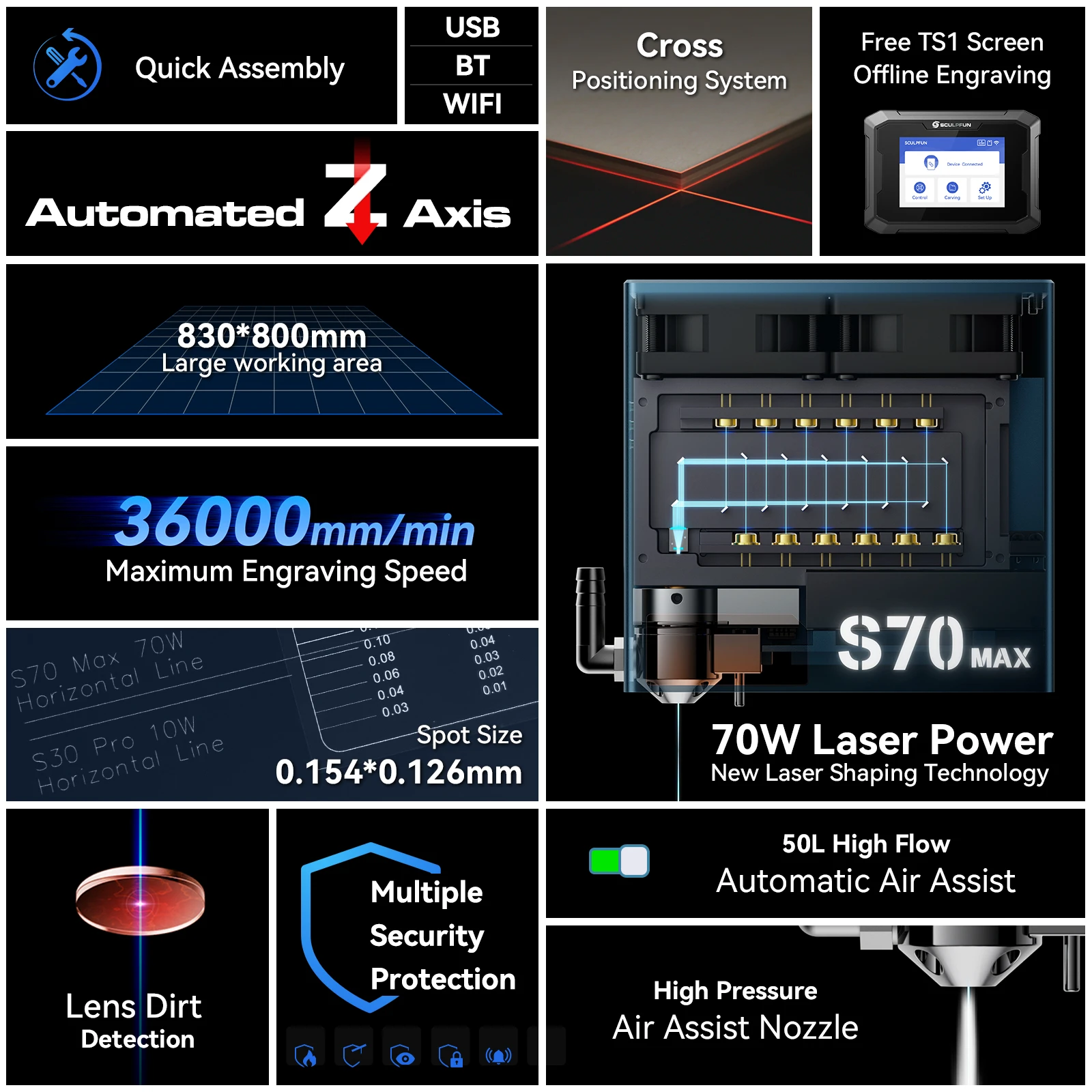 SCULPFUN S70 Max 70W Laser Engraver Cutting Machine 50L Air Assist Kit 830*800mm Engraving Area One-Click Auto-Focus For Glass
