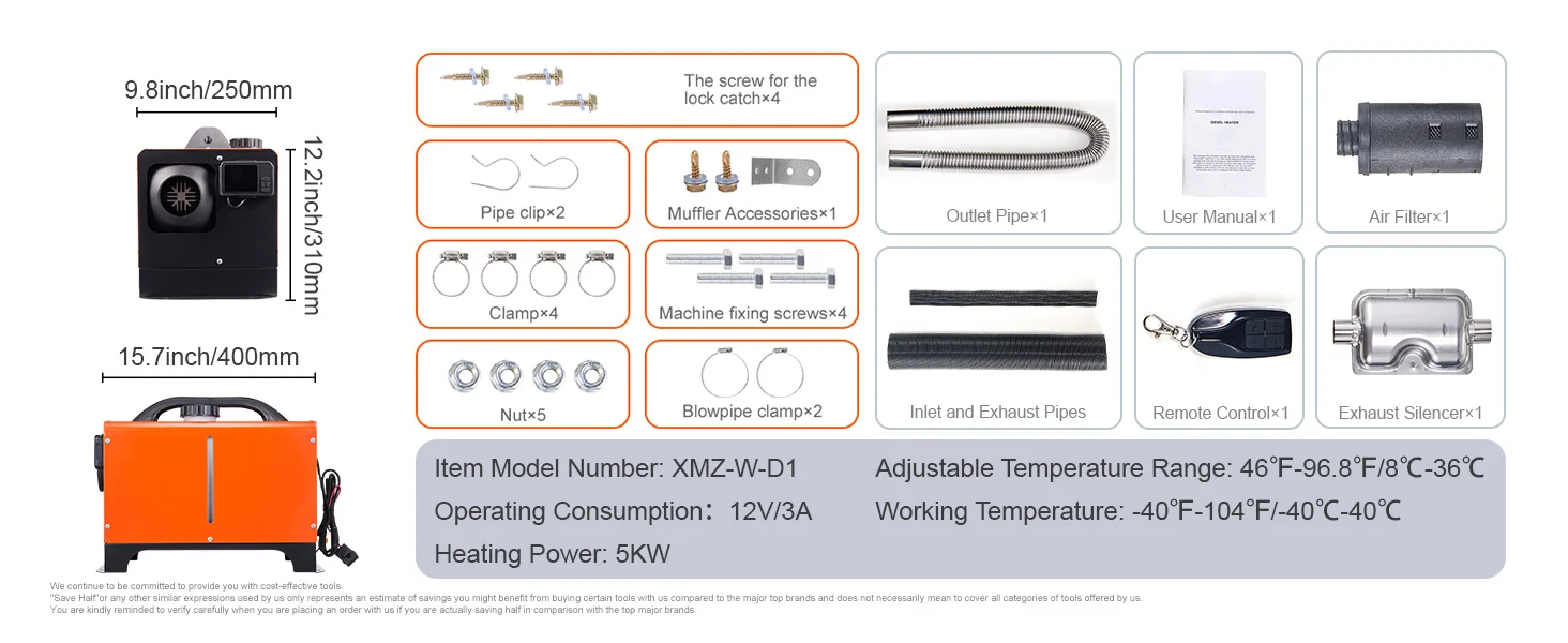 Working Temperature: -104℉-104℉/-40℃-40℃, Applicable Altitude: Below18045 ft /5500 m, Item Model Number: XMZ-D1, Operating Consumption: 12V/3A, Heating Power: 5 KW, BTU: 15-20 m²/161-215ft², Net Weight: 8.95 kg/19.7 lbs, Air Outlet Pipe Inner Diameter:76.5 mm /3 in, Product Size: 400×250×310 mm/15.7×9.8×12.2 inch, Fuel Consumption: 0.16-0.52 L/H, Fuel Tank Volume: 5 L/1.3 Gal, Control Method: LCD+Remote Control+Bluetooth, Adjustable Temperature Range: 46℉-96.8℉/8℃-36℃