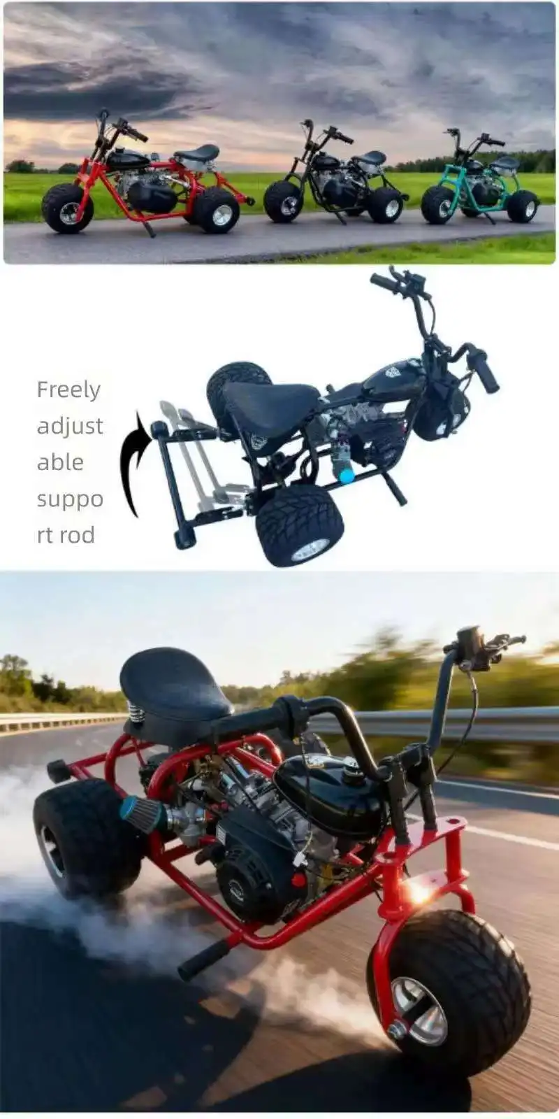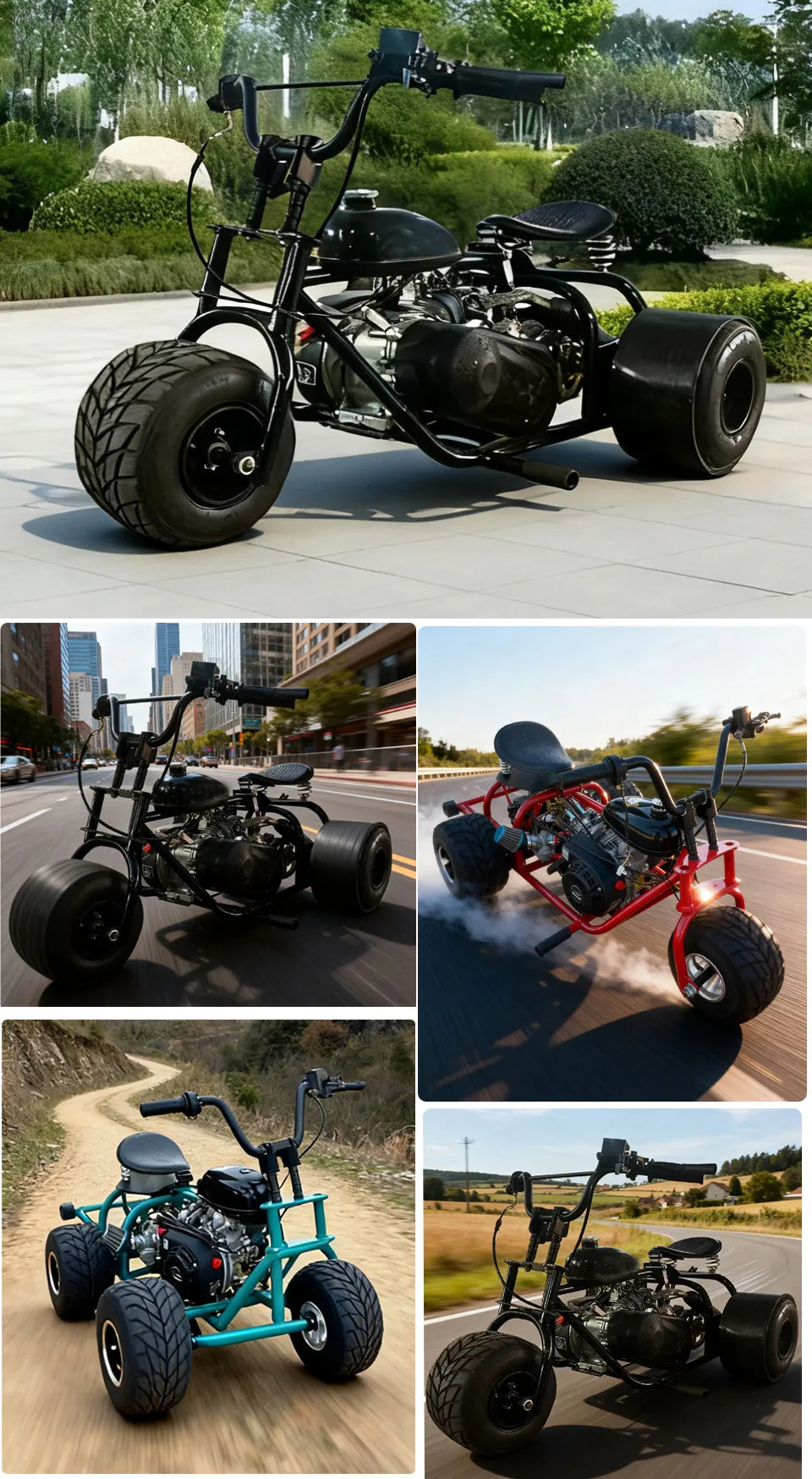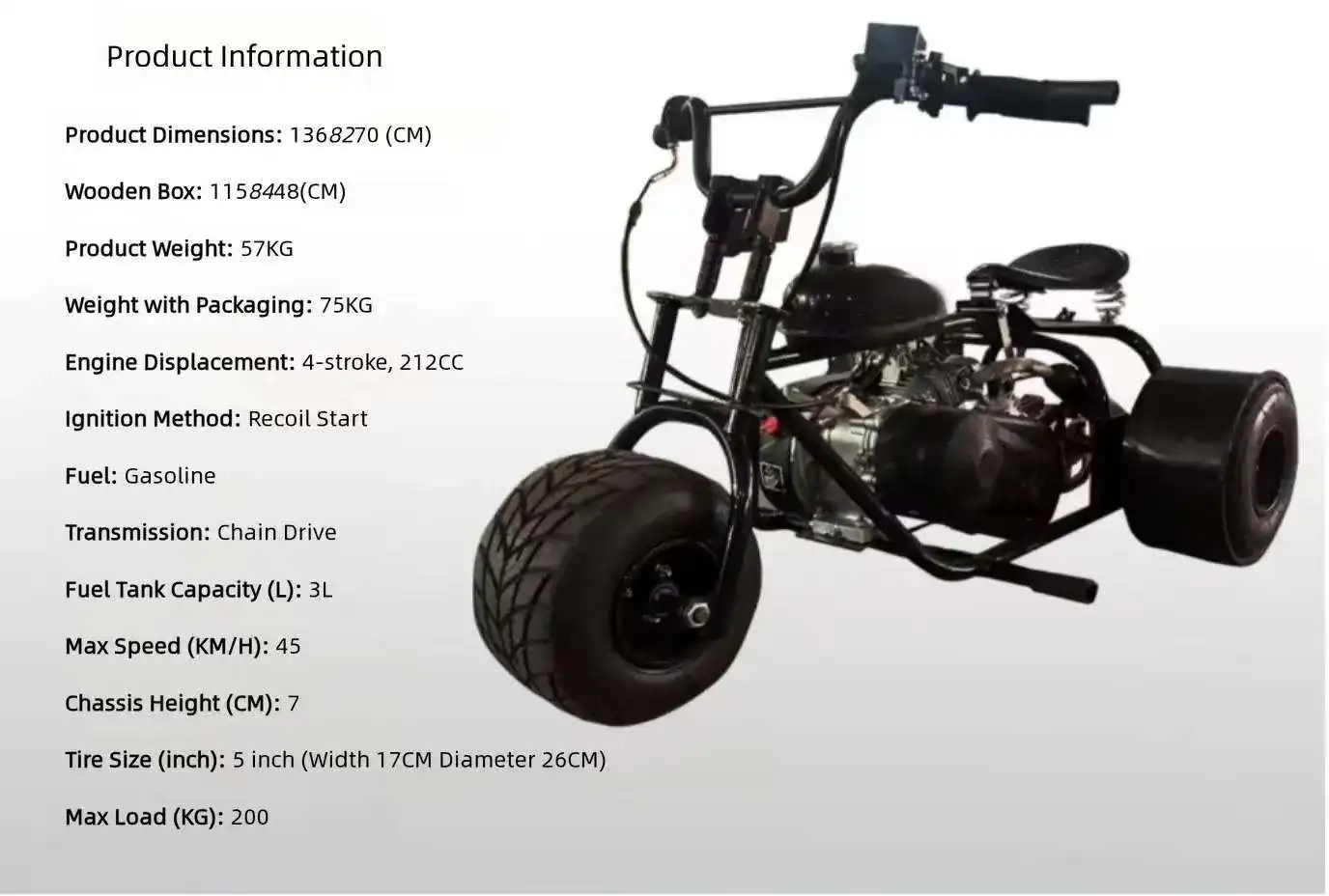 Equipped with a reliable gas-powered engine, this three-wheeled kart offers impressive acceleration and top speed suitable for drift racing enthusiasts. The engine’s fuel efficiency and smooth throttle response allow long-lasting enjoyment without frequent refueling. Designed to handle rough terrain, including sandy beaches and dirt tracks, the kart’s powertrain ensures consistent performance for off-road adventures and drift-offs.