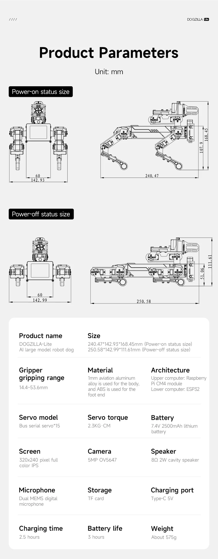 DOGZILLA-Lite is a 15-DOF desktop AI bionic robot dog. It is made of aluminum alloy and comes with a robotic arm and gripper, which can flexibly perform grasping tasks. Built-in Raspberry Pi CM4 module, supports face detection, object recognition, and AI visual interaction. Combined with a large model, it can not only understand instructions, but also realize free dialogue, realizing true multimodal intelligent interaction. It has advanced sports capabilities such as omnidirectional movement, six-dimensional posture control, and dynamic balance. With more than 40+ functions, from basic remote control to embodied intelligent applications, it allows learning, entertainment, and technology research to be fully upgraded. In front of the robot dog, a 2.0-inch IPS display is integrated to display 35 different expressions.Support two control methods: BT APP and WiFi APP. Whether it is programming learning, AI experiments, or creative interaction, DOGZILLA-Lite is your best partner.