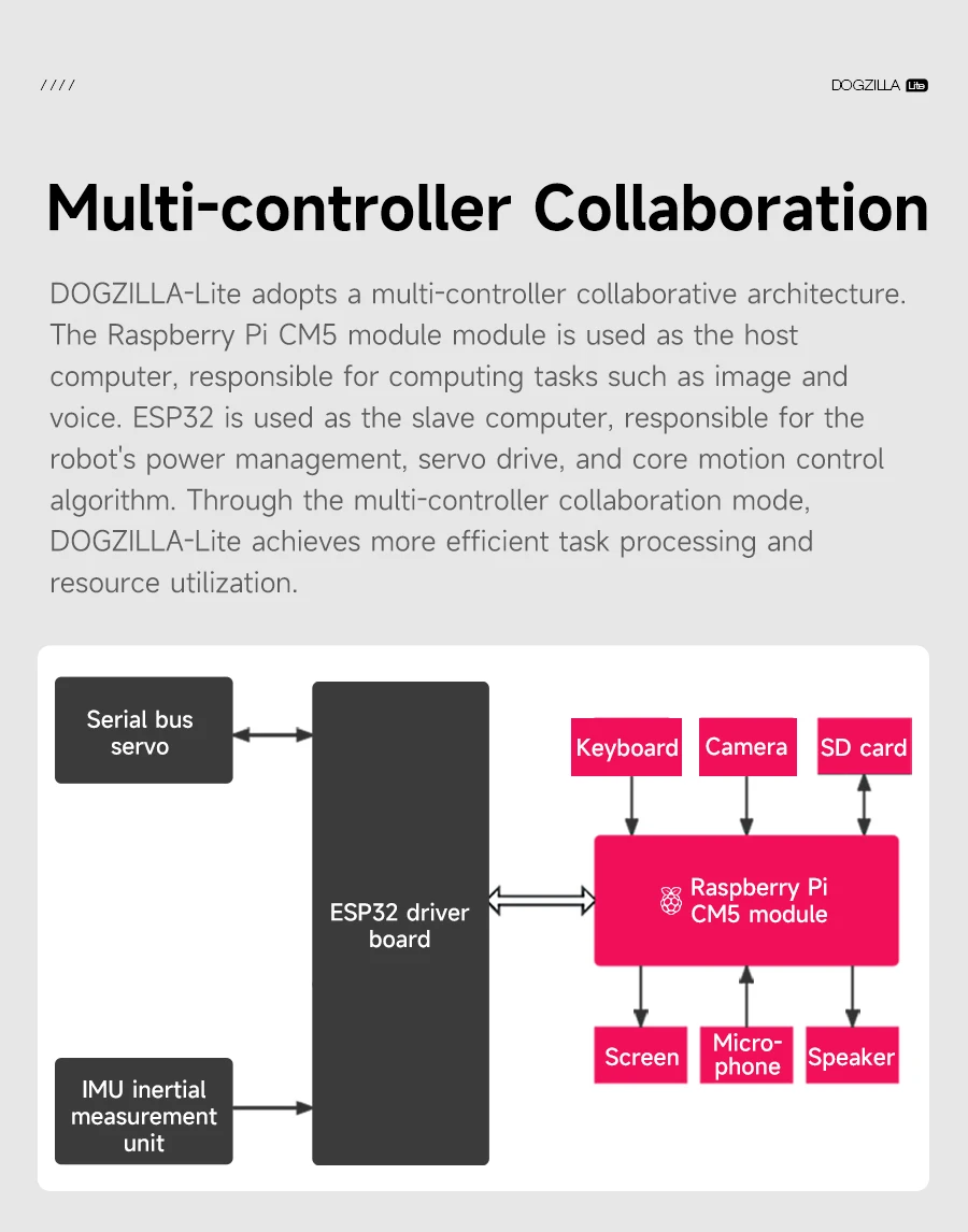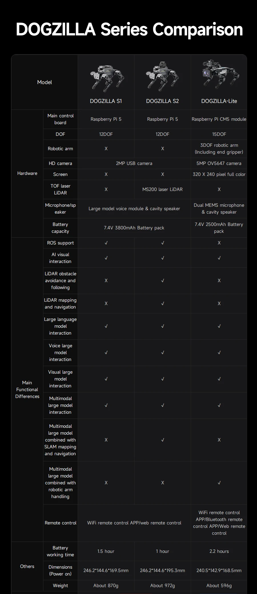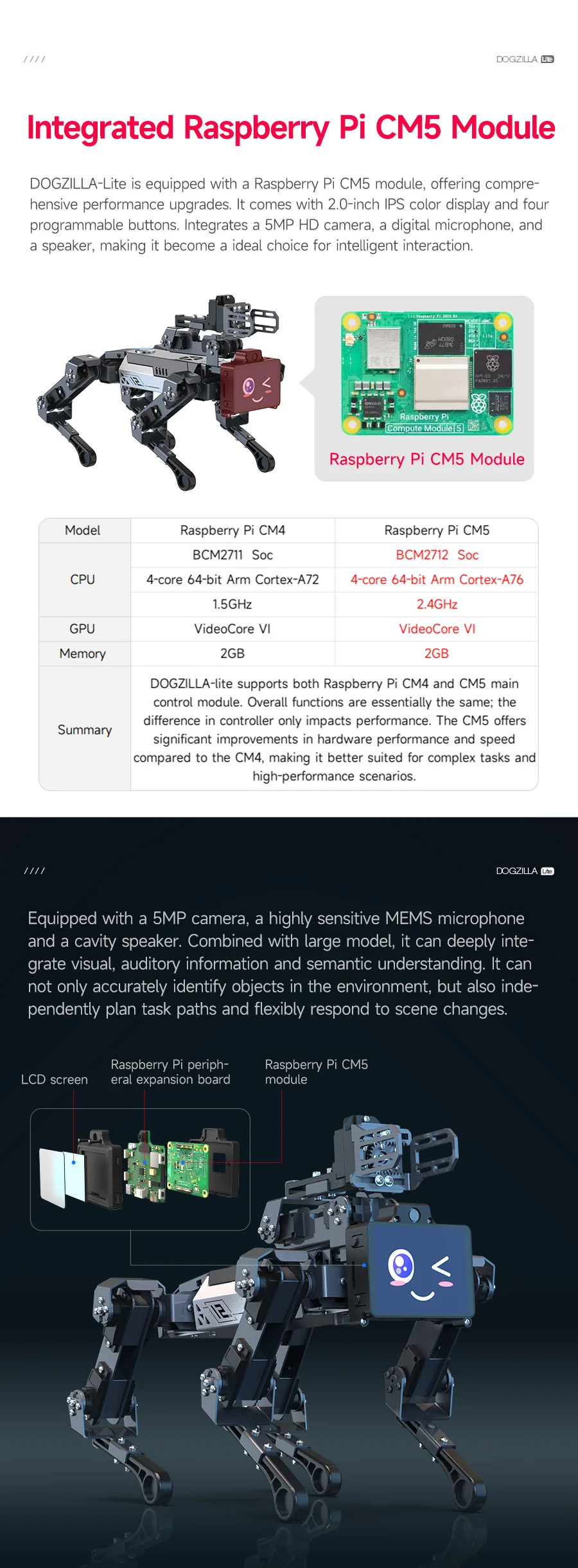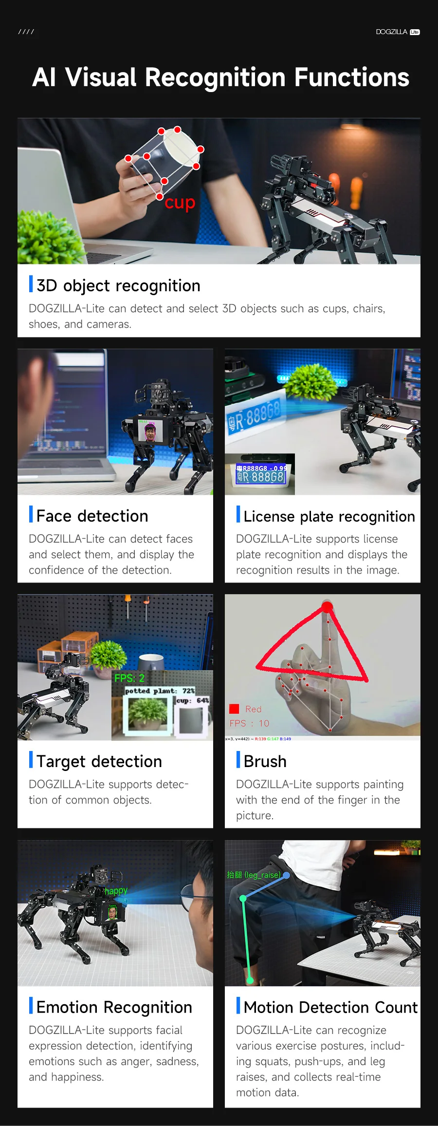 DOGZILLA-Lite is a 15-DOF desktop AI bionic robot dog. It is made of aluminum alloy and comes with a robotic arm and gripper, which can flexibly perform grasping tasks. Built-in Raspberry Pi CM5 module, supports face detection, object recognition, and AI visual interaction. Combined with a large model, it can not only understand instructions, but also realize free dialogue, realizing true multimodal intelligent interaction. It has advanced sports capabilities such as omnidirectional movement, six-dimensional posture control, and dynamic balance. With more than 40+ functions, from basic remote control to embodied intelligent applications, it allows learning, entertainment, and technology research to be fully upgraded. In front of the robot dog, a 2.0-inch IPS display is integrated to display 35 different expressions.Support two control methods: BT APP and WiFi APP. Whether it is programming learning, AI experiments, or creative interaction, DOGZILLA-Lite is your best partner.